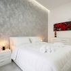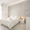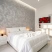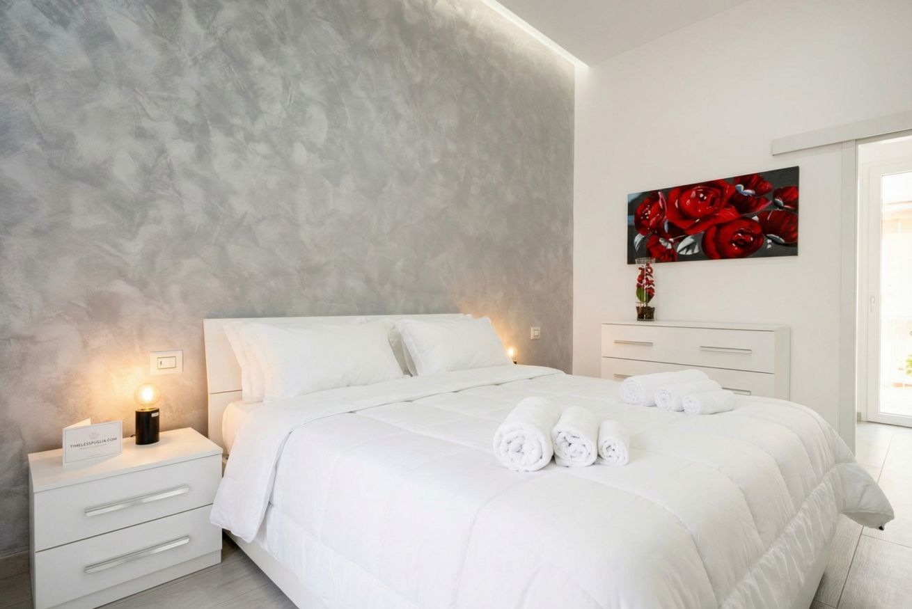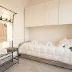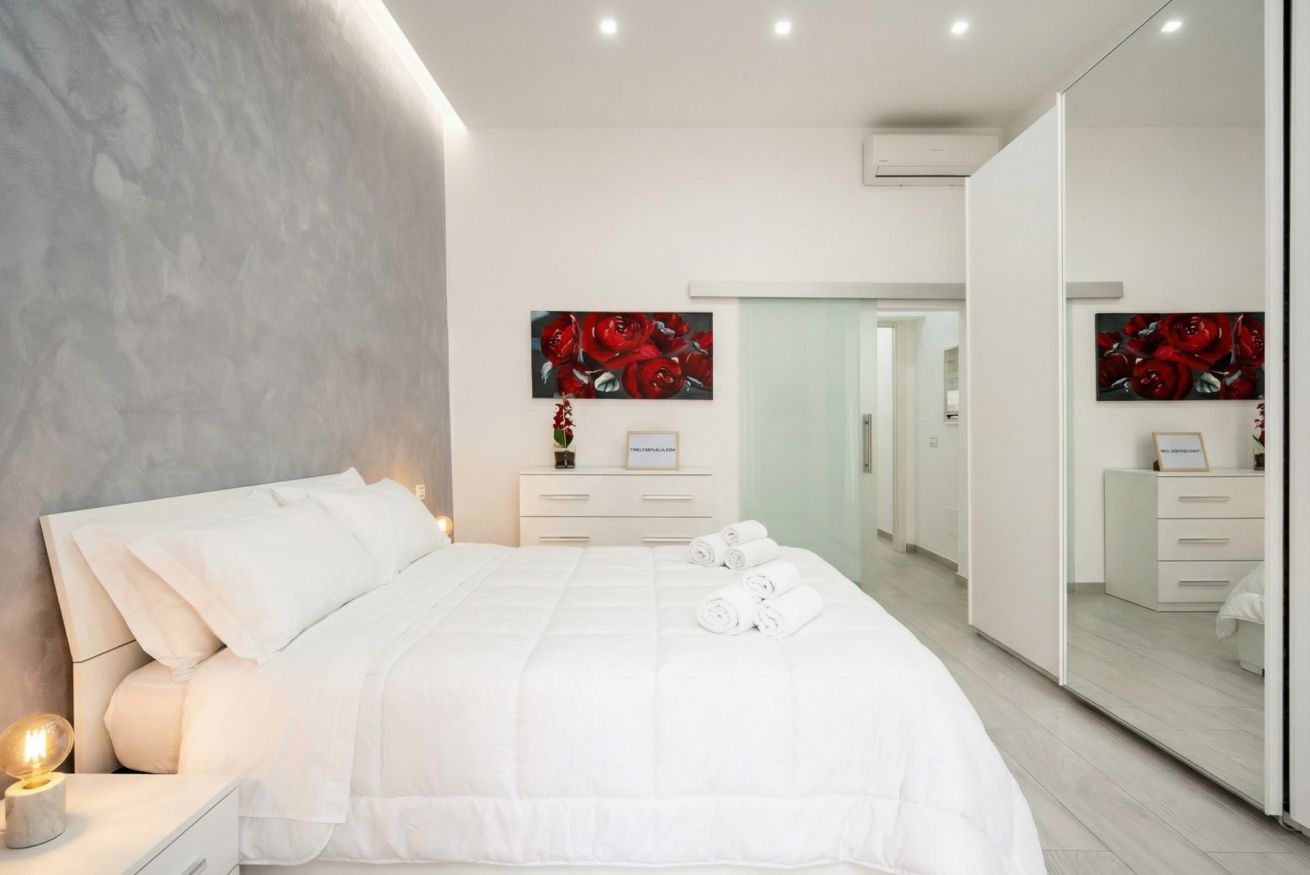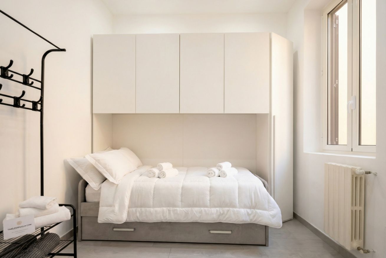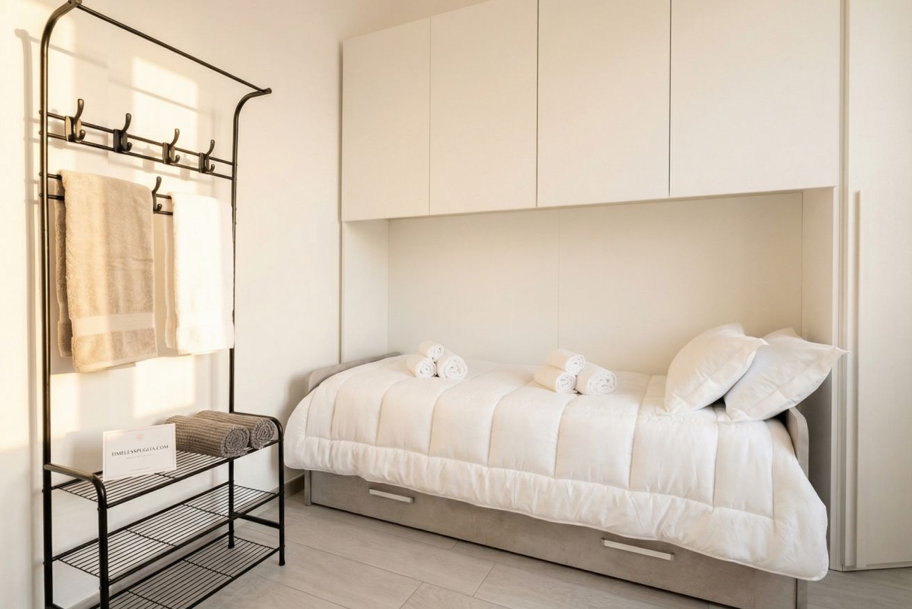 Quando è il momento di rilassarsi, le camere da letto offrono un rifugio tranquillo. La camera principale dispone di un letto matrimoniale con biancheria blu a fantasia, una parete decorativa testurizzata e accesso diretto a un balcone privato con vista sui tetti dai toni caldi e le strade storiche di Bari. La seconda camera, accogliente e funzionale, offre ulteriore flessibilità con armadi a muro e uno stile minimalista.