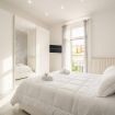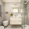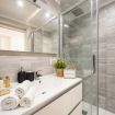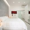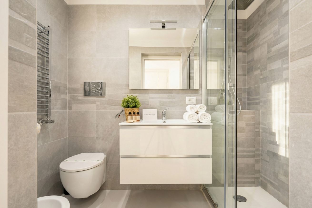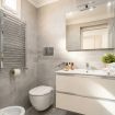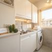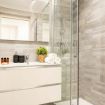 Il bagno è un vero esempio di design moderno, con piastrelle in pietra grigia di grande formato, lavabo sospeso bianco e una rilassante doccia walk-in con soffione a pioggia. Gli ospiti potranno inoltre usufruire di WiFi ad alta velocità, aria condizionata e lavatrice integrata per la massima comodità.