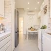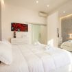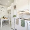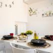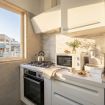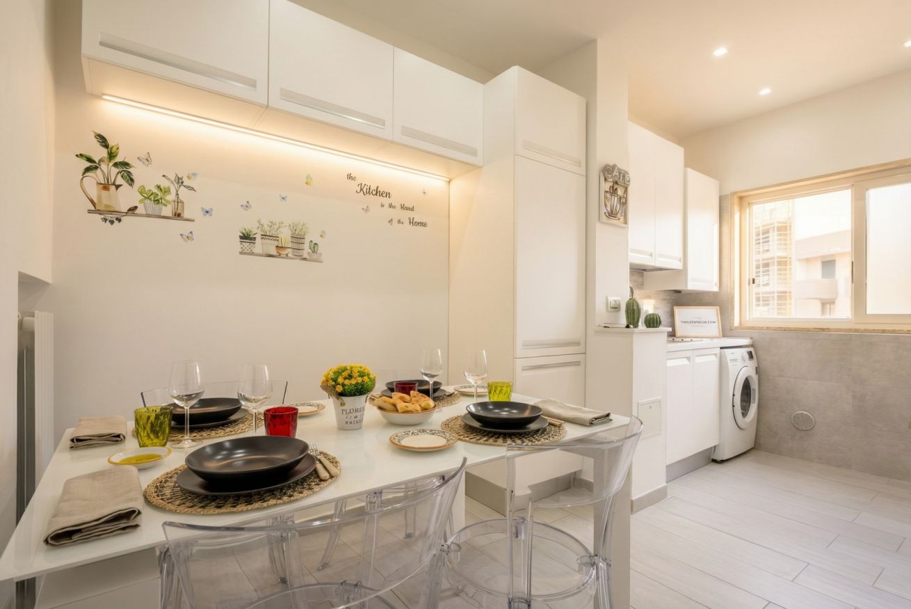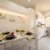 Gli amanti della cucina apprezzeranno la luminosa cucina a galley, moderna e completamente attrezzata, con eleganti mobili bianchi, elettrodomestici in acciaio inox, microonde e una macchina da caffè di alta qualità per iniziare al meglio la giornata. La zona pranzo adiacente, con sedie trasparenti minimaliste e opere d’arte giocose alle pareti, offre uno spazio luminoso e accogliente per gustare i prodotti locali.