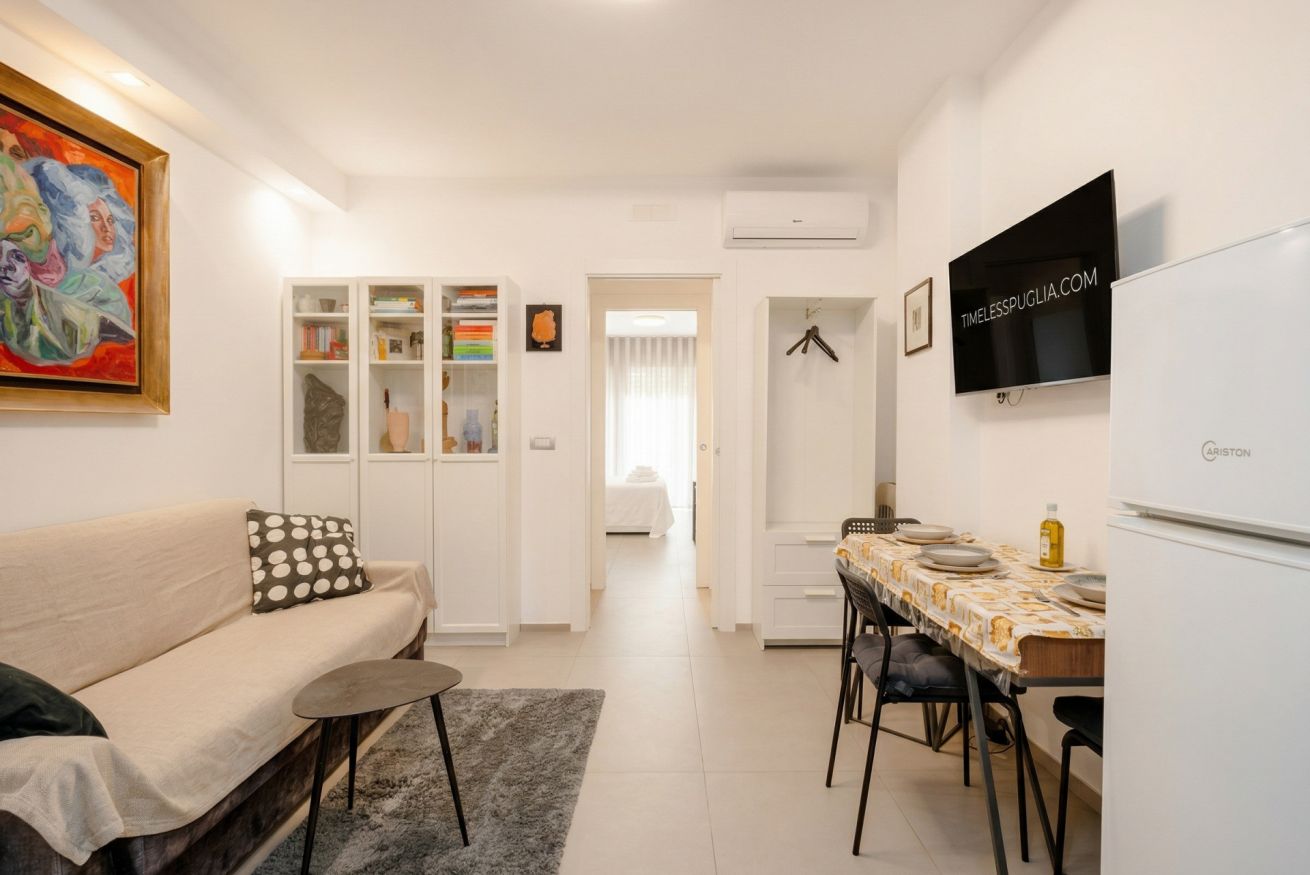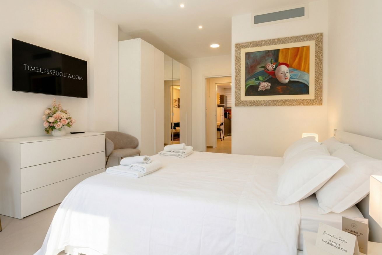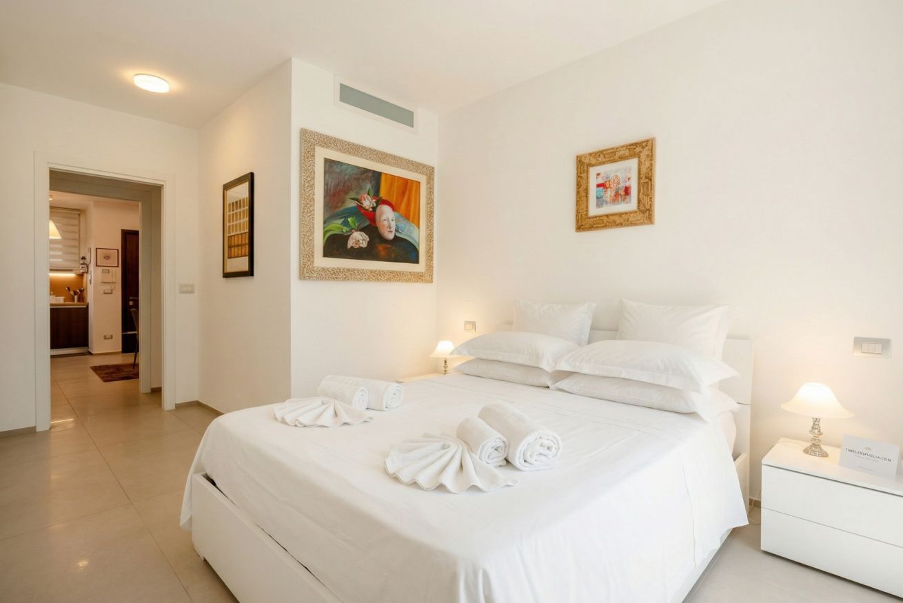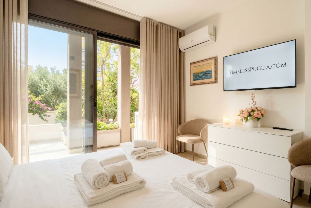 Escape to the heart of Bari at Elena's Garden Luxury Apartment, a thoughtfully curated retreat designed for those who appreciate both aesthetic beauty and modern convenience. Situated on the first floor of a charming building, this property serves as a sophisticated urban sanctuary that balances contemporary minimalism with bold, artistic accents. From the moment you step inside, you are greeted by an open-concept living space defined by its clean lines, neutral palette, and vibrant abstract wall art. The kitchen area is a masterclass in modern design, featuring sleek matte grey cabinetry, warm wood-effect backsplashes, and high-end appliances, including an induction cooktop and a coffee machine, ensuring your culinary needs are effortlessly met. The living area invites you to unwind on a comfortable sofa, surrounded by curated bookshelves and a wall-mounted flat-screen television. Perhaps the true highlight of this home is the serene bedroom, which features a plush queen-sized bed, designer lighting, and striking Venetian-inspired artwork. Floor-to-ceiling glass sliding doors act as a gateway to your private garden terrace, where you can enjoy a quiet morning espresso while overlooking lush greenery—a rare find in the city. The bathroom offers a spa-like experience with its tropical leaf-print wallpaper, a modern wood-veneer vanity, and a spacious glass-enclosed walk-in shower with a rainfall showerhead for ultimate relaxation. Every detail, from the blackout curtains and climate-controlled air conditioning to the heated towel racks and premium toiletries, has been considered to provide a seamless travel experience. Whether you are exploring the historic streets of Bari or returning from the local beaches, this apartment offers the perfect blend of tranquility and style. With its prime location on Via Redavid and its thoughtfully equipped interiors, this is more than just a place to stay—it is an inspiring destination in itself.