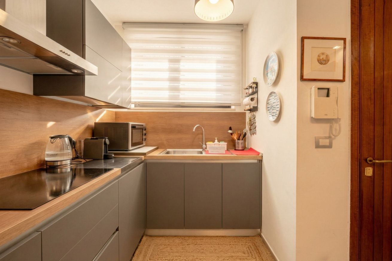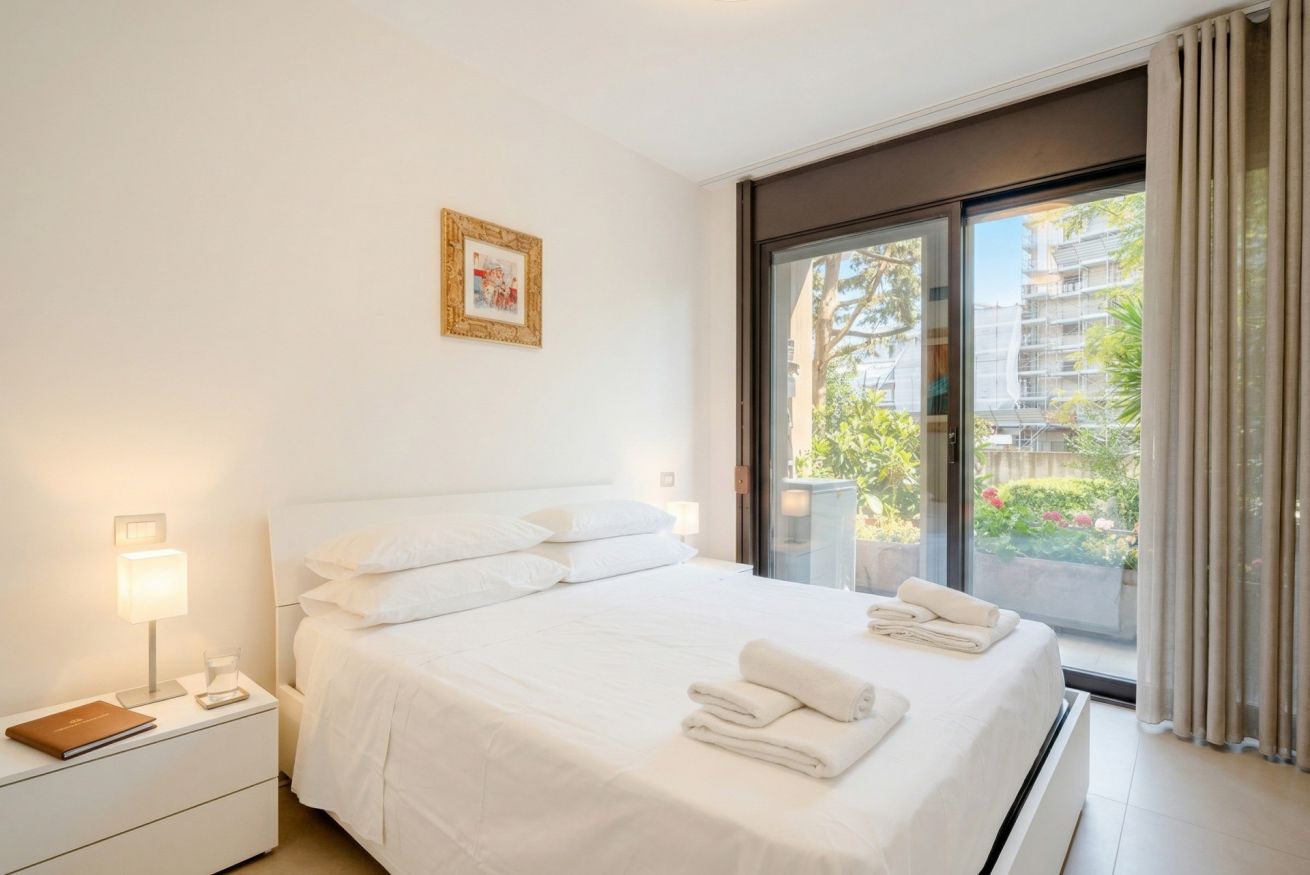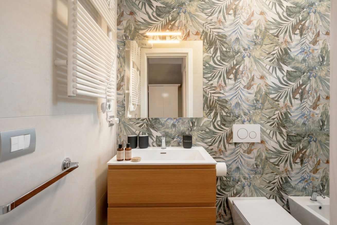 Escape to the heart of Bari at Elena's Garden Luxury Apartment, a thoughtfully curated retreat designed for those who appreciate both aesthetic beauty and modern convenience. Situated on the first floor of a charming building, this property serves as a sophisticated urban sanctuary that balances contemporary minimalism with bold, artistic accents. From the moment you step inside, you are greeted by an open-concept living space defined by its clean lines, neutral palette, and vibrant abstract wall art. The kitchen area is a masterclass in modern design, featuring sleek matte grey cabinetry, warm wood-effect backsplashes, and high-end appliances, including an induction cooktop and a coffee machine, ensuring your culinary needs are effortlessly met. The living area invites you to unwind on a comfortable sofa, surrounded by curated bookshelves and a wall-mounted flat-screen television. Perhaps the true highlight of this home is the serene bedroom, which features a plush queen-sized bed, designer lighting, and striking Venetian-inspired artwork. Floor-to-ceiling glass sliding doors act as a gateway to your private garden terrace, where you can enjoy a quiet morning espresso while overlooking lush greenery—a rare find in the city. The bathroom offers a spa-like experience with its tropical leaf-print wallpaper, a modern wood-veneer vanity, and a spacious glass-enclosed walk-in shower with a rainfall showerhead for ultimate relaxation. Every detail, from the blackout curtains and climate-controlled air conditioning to the heated towel racks and premium toiletries, has been considered to provide a seamless travel experience. Whether you are exploring the historic streets of Bari or returning from the local beaches, this apartment offers the perfect blend of tranquility and style. With its prime location on Via Redavid and its thoughtfully equipped interiors, this is more than just a place to stay—it is an inspiring destination in itself.
