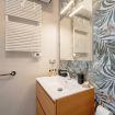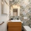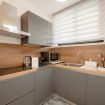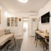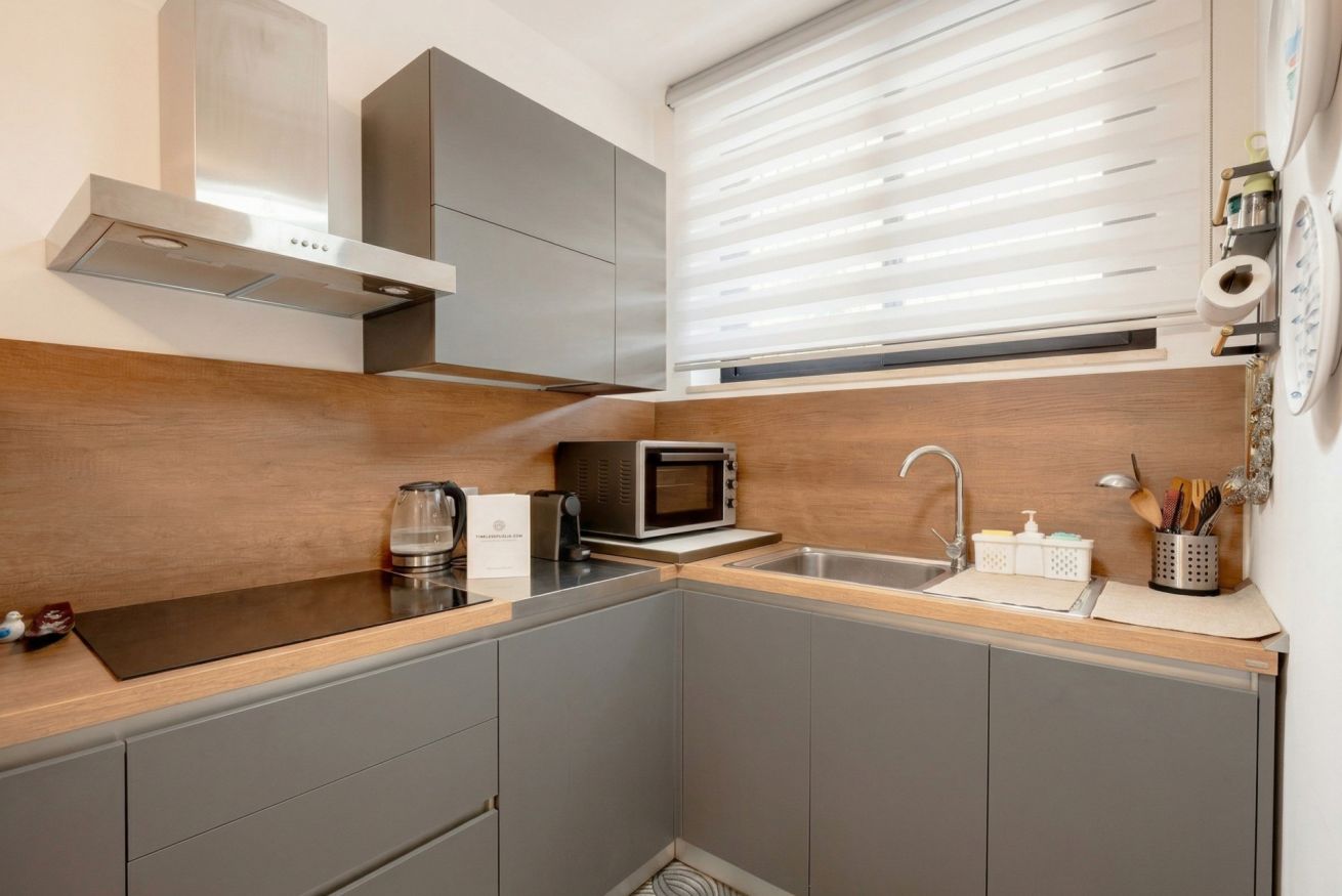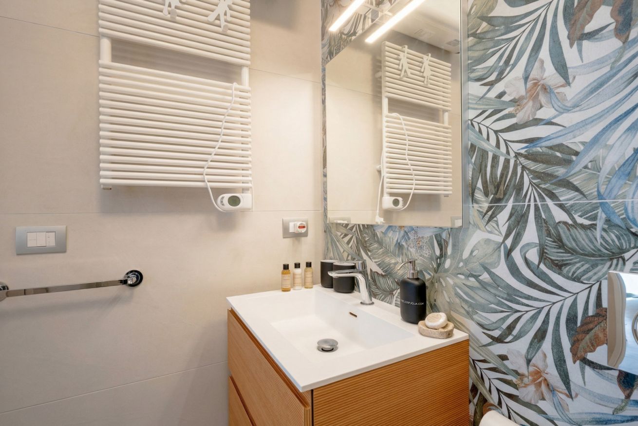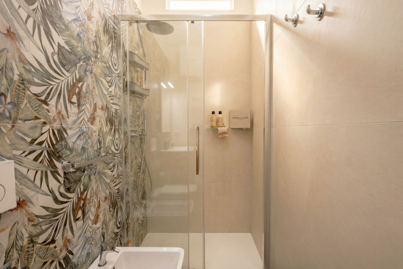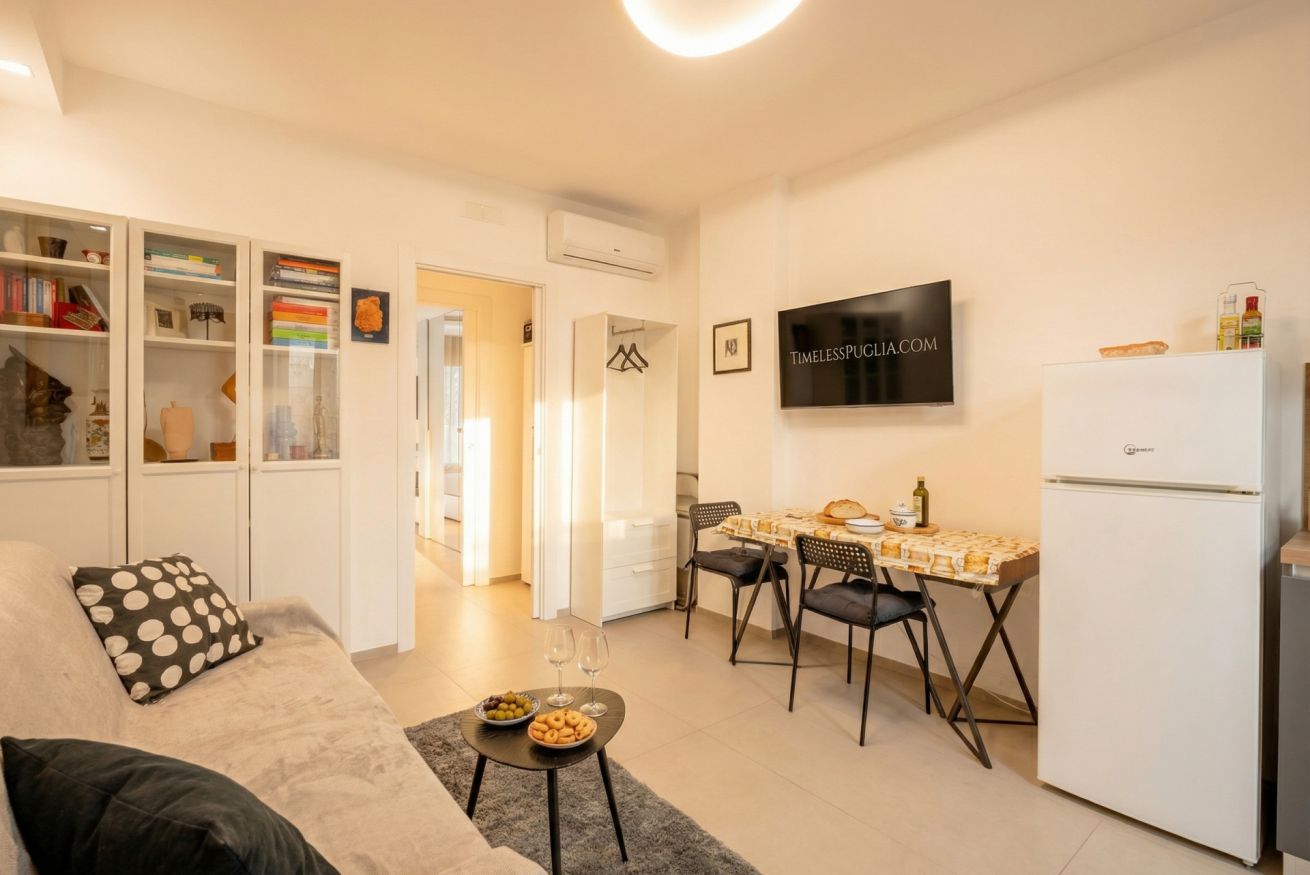 Escape to the heart of Bari at Elena's Garden Luxury Apartment, a thoughtfully curated retreat designed for those who appreciate both aesthetic beauty and modern convenience. Situated on the first floor of a charming building, this property serves as a sophisticated urban sanctuary that balances contemporary minimalism with bold, artistic accents. From the moment you step inside, you are greeted by an open-concept living space defined by its clean lines, neutral palette, and vibrant abstract wall art. The kitchen area is a masterclass in modern design, featuring sleek matte grey cabinetry, warm wood-effect backsplashes, and high-end appliances, including an induction cooktop and a coffee machine, ensuring your culinary needs are effortlessly met. The living area invites you to unwind on a comfortable sofa, surrounded by curated bookshelves and a wall-mounted flat-screen television. Perhaps the true highlight of this home is the serene bedroom, which features a plush queen-sized bed, designer lighting, and striking Venetian-inspired artwork. Floor-to-ceiling glass sliding doors act as a gateway to your private garden terrace, where you can enjoy a quiet morning espresso while overlooking lush greenery—a rare find in the city. The bathroom offers a spa-like experience with its tropical leaf-print wallpaper, a modern wood-veneer vanity, and a spacious glass-enclosed walk-in shower with a rainfall showerhead for ultimate relaxation. Every detail, from the blackout curtains and climate-controlled air conditioning to the heated towel racks and premium toiletries, has been considered to provide a seamless travel experience. Whether you are exploring the historic streets of Bari or returning from the local beaches, this apartment offers the perfect blend of tranquility and style. With its prime location on Via Redavid and its thoughtfully equipped interiors, this is more than just a place to stay—it is an inspiring destination in itself.