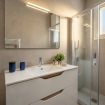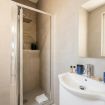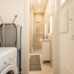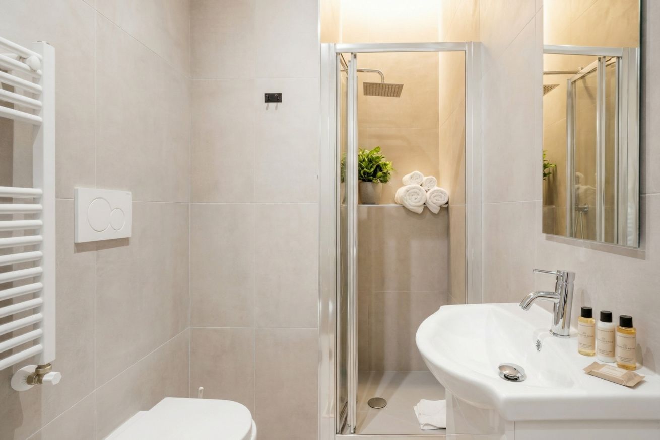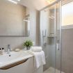 I bagni moderni, rifiniti con eleganti piastrelle taupe-grigio di grande formato, offrono un’esperienza simile a una spa grazie alle ampie docce walk-in con soffione a pioggia e scaldasalviette.