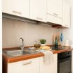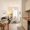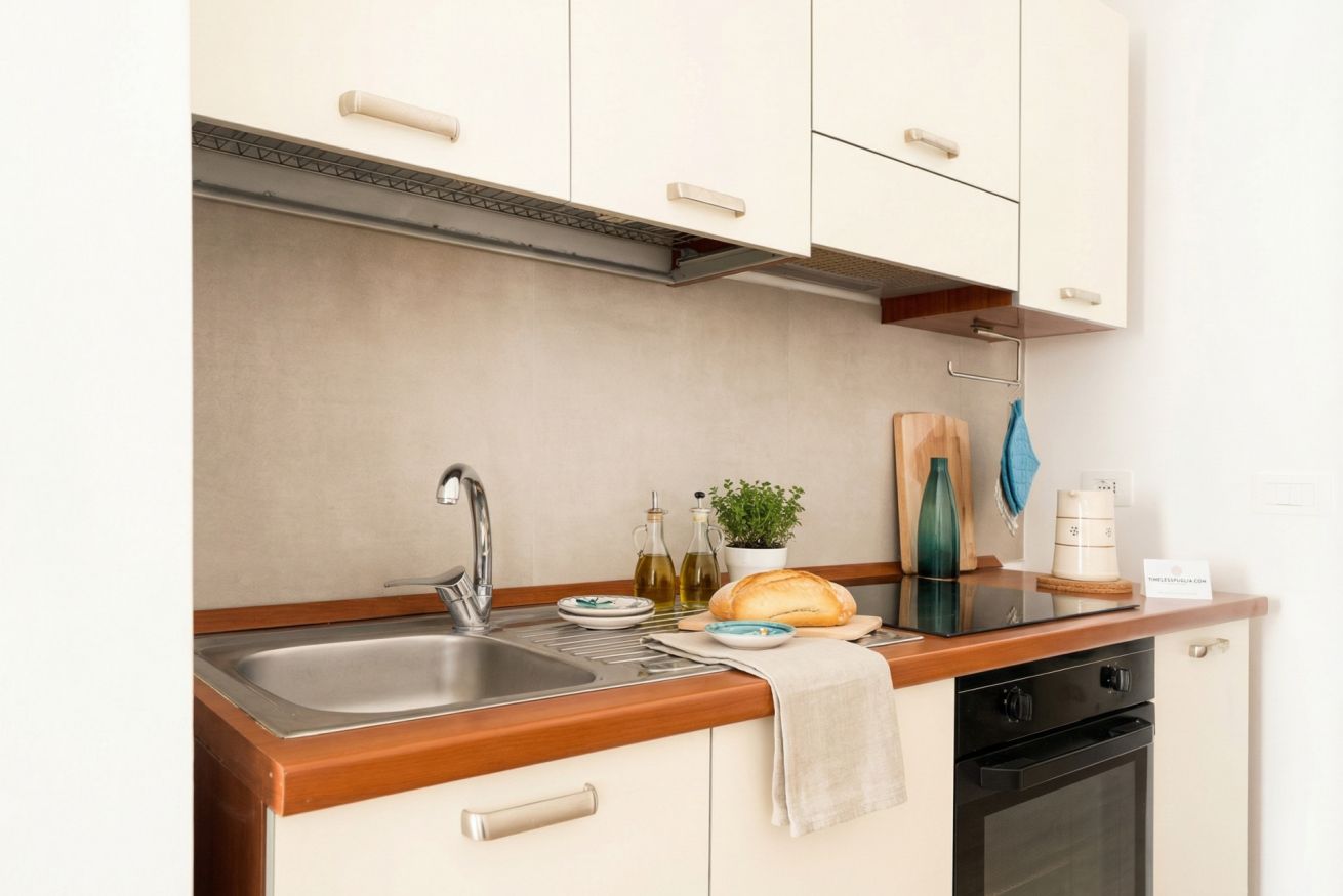 La cucina, compatta ma efficiente, è completamente attrezzata con mobili in tonalità bianco opaco, piani di lavoro effetto legno e elettrodomestici di qualità, ideale per preparare un espresso al mattino o uno spuntino serale.