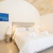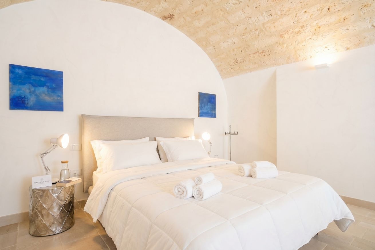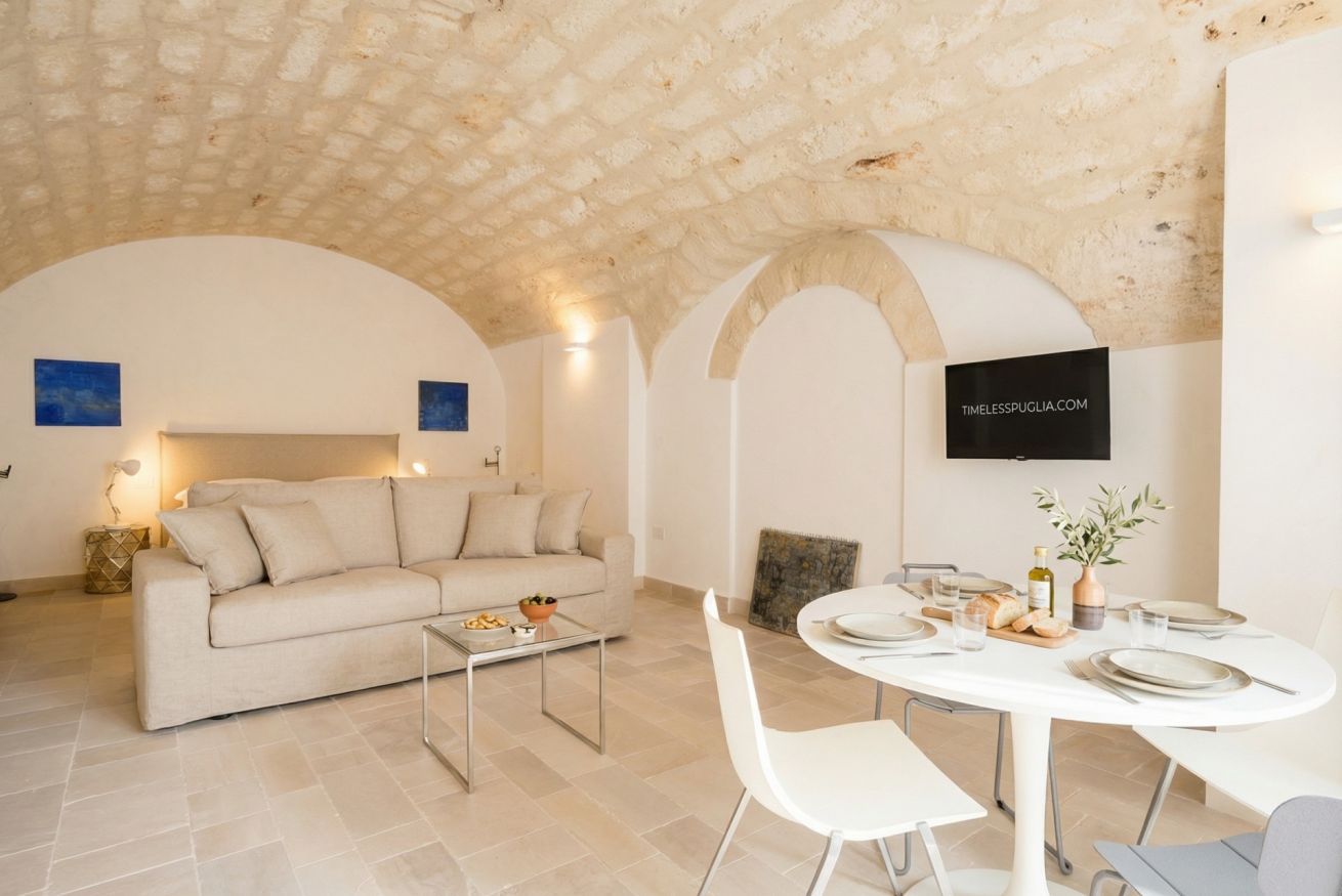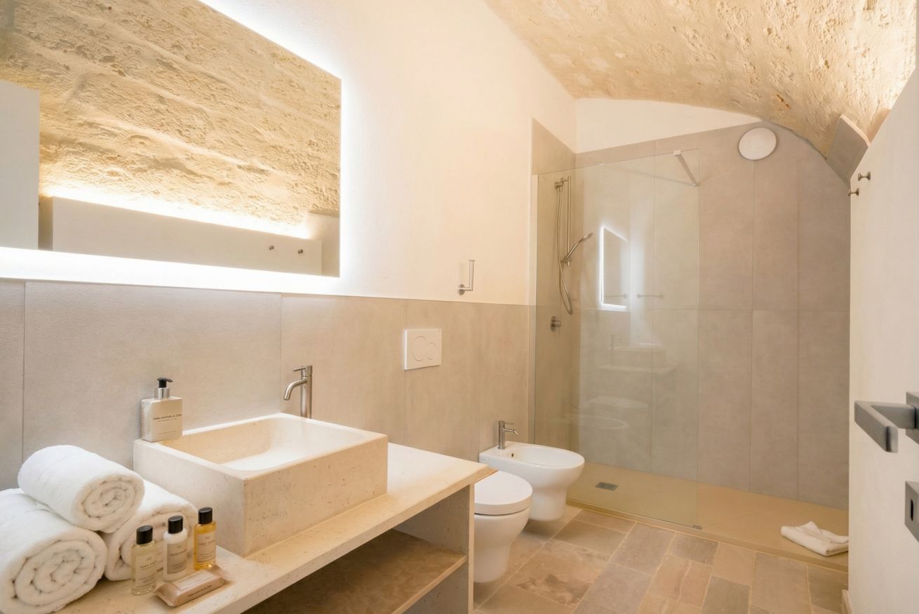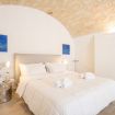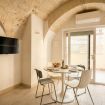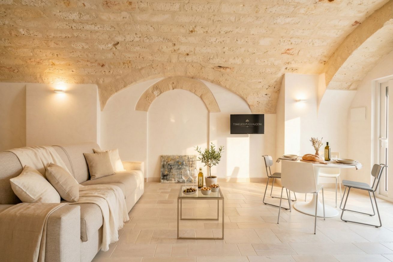 Escape to the timeless beauty of the Italian coast with a stay at Palazzo della Torre 001, an exquisite sanctuary located just outside the vibrant heart of Bari. This sophisticated property serves as the perfect base for travelers looking to balance the cultural energy of the city with the peaceful, airy atmosphere of an authentic Puglian dwelling. From the moment you step inside, you are greeted by the striking, iconic vaulted tuff stone ceilings that define the architecture of this region, paired beautifully with light, neutral tones and modern minimalist decor. The open-concept living space is bathed in natural light, offering a seamless flow between the elegant, beige-toned lounge area and the minimalist dining space. Large glass sliding doors invite you out onto a private terrace, a quintessential spot for savoring a local espresso or winding down after a day of exploration. The kitchen is designed with simplicity and efficiency in mind, featuring crisp white cabinetry, a seamless countertop, and essential amenities including an induction stovetop and coffee machine. Rest comes easily in the tranquil sleeping area, where a plush, grey-upholstered queen bed waits, accented by metallic side tables and tasteful, abstract blue art that reflects the coastal spirit. The ensuite bathroom is a true highlight, marrying raw historical character with modern luxury; it features a spacious, walk-in glass shower, a stone vessel sink, and warm LED-backlit mirrors. Every element of this home, from the cooling air conditioning to the thoughtful storage solutions, has been curated to ensure a seamless experience. Whether you are traveling for a romantic getaway or a serene retreat, this residence provides a unique blend of heritage and high-end comfort. Situated with convenient access to the wonders of Bari, this property invites you to slow down, breathe, and fully immerse yourself in the warm, welcoming pace of life in Italy.