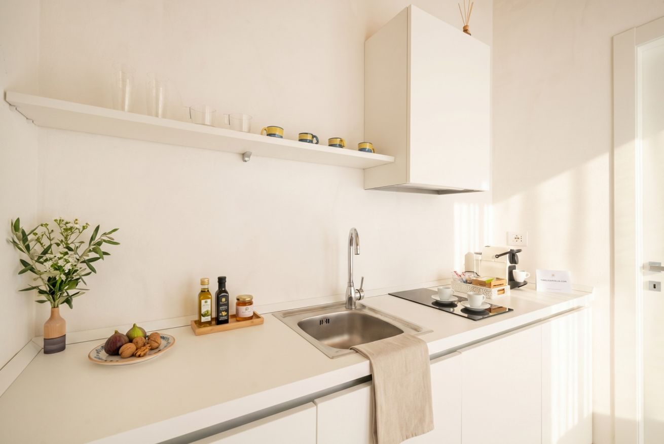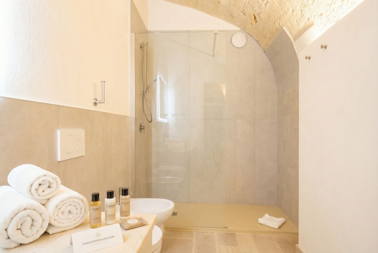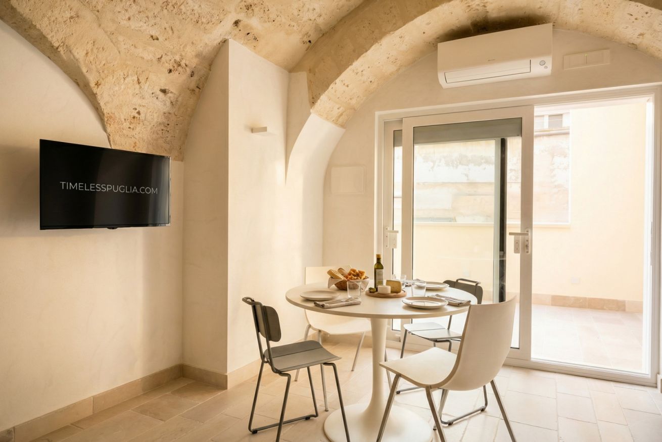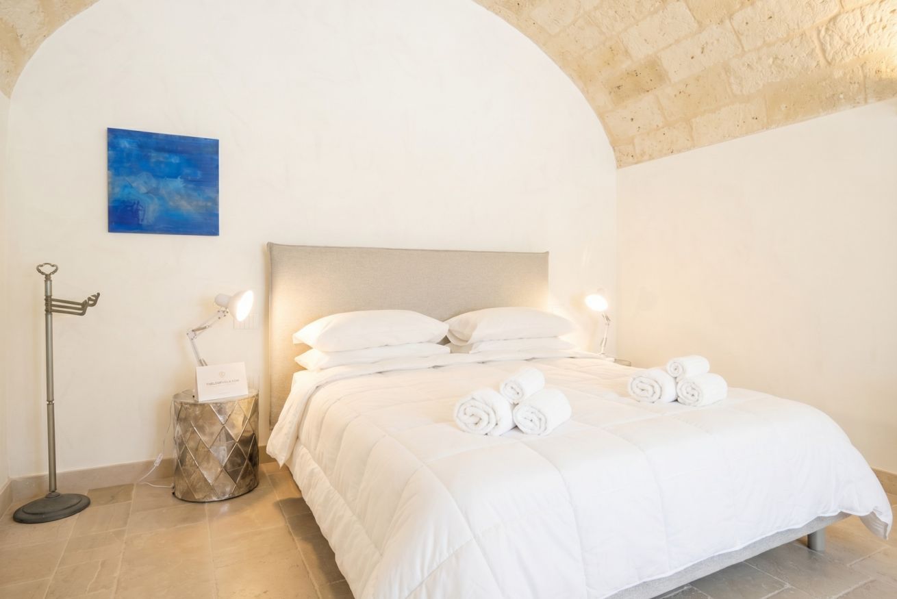 Escape to the timeless beauty of the Italian coast with a stay at Palazzo della Torre 001, an exquisite sanctuary located just outside the vibrant heart of Bari. This sophisticated property serves as the perfect base for travelers looking to balance the cultural energy of the city with the peaceful, airy atmosphere of an authentic Puglian dwelling. From the moment you step inside, you are greeted by the striking, iconic vaulted tuff stone ceilings that define the architecture of this region, paired beautifully with light, neutral tones and modern minimalist decor. The open-concept living space is bathed in natural light, offering a seamless flow between the elegant, beige-toned lounge area and the minimalist dining space. Large glass sliding doors invite you out onto a private terrace, a quintessential spot for savoring a local espresso or winding down after a day of exploration. The kitchen is designed with simplicity and efficiency in mind, featuring crisp white cabinetry, a seamless countertop, and essential amenities including an induction stovetop and coffee machine. Rest comes easily in the tranquil sleeping area, where a plush, grey-upholstered queen bed waits, accented by metallic side tables and tasteful, abstract blue art that reflects the coastal spirit. The ensuite bathroom is a true highlight, marrying raw historical character with modern luxury; it features a spacious, walk-in glass shower, a stone vessel sink, and warm LED-backlit mirrors. Every element of this home, from the cooling air conditioning to the thoughtful storage solutions, has been curated to ensure a seamless experience. Whether you are traveling for a romantic getaway or a serene retreat, this residence provides a unique blend of heritage and high-end comfort. Situated with convenient access to the wonders of Bari, this property invites you to slow down, breathe, and fully immerse yourself in the warm, welcoming pace of life in Italy.