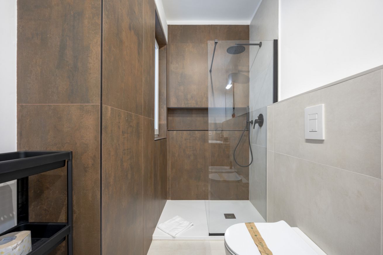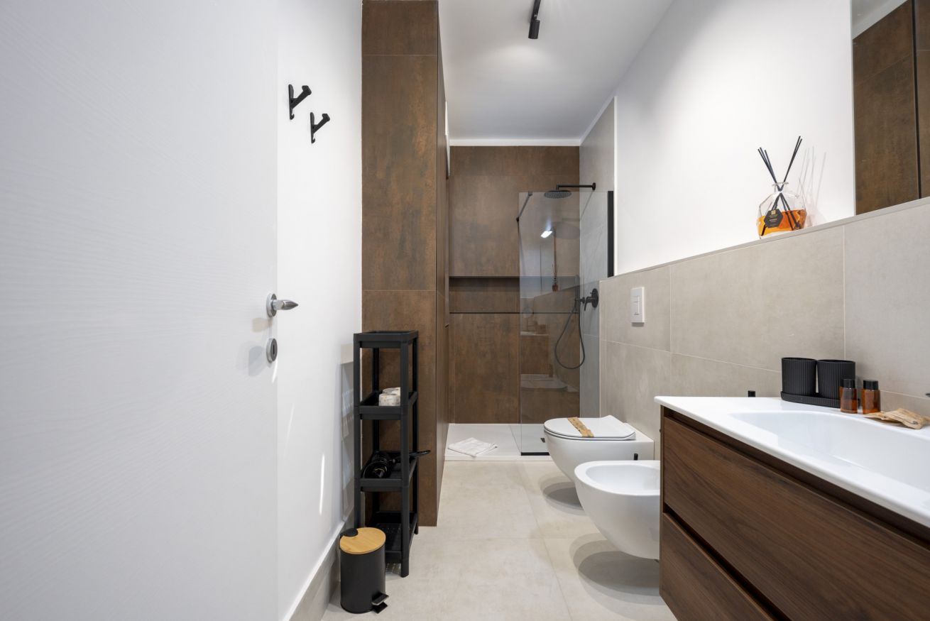 The bathroom is modern, clean, and functional, with high-quality fixtures and a fresh design that adds to the overall comfort of the apartment.