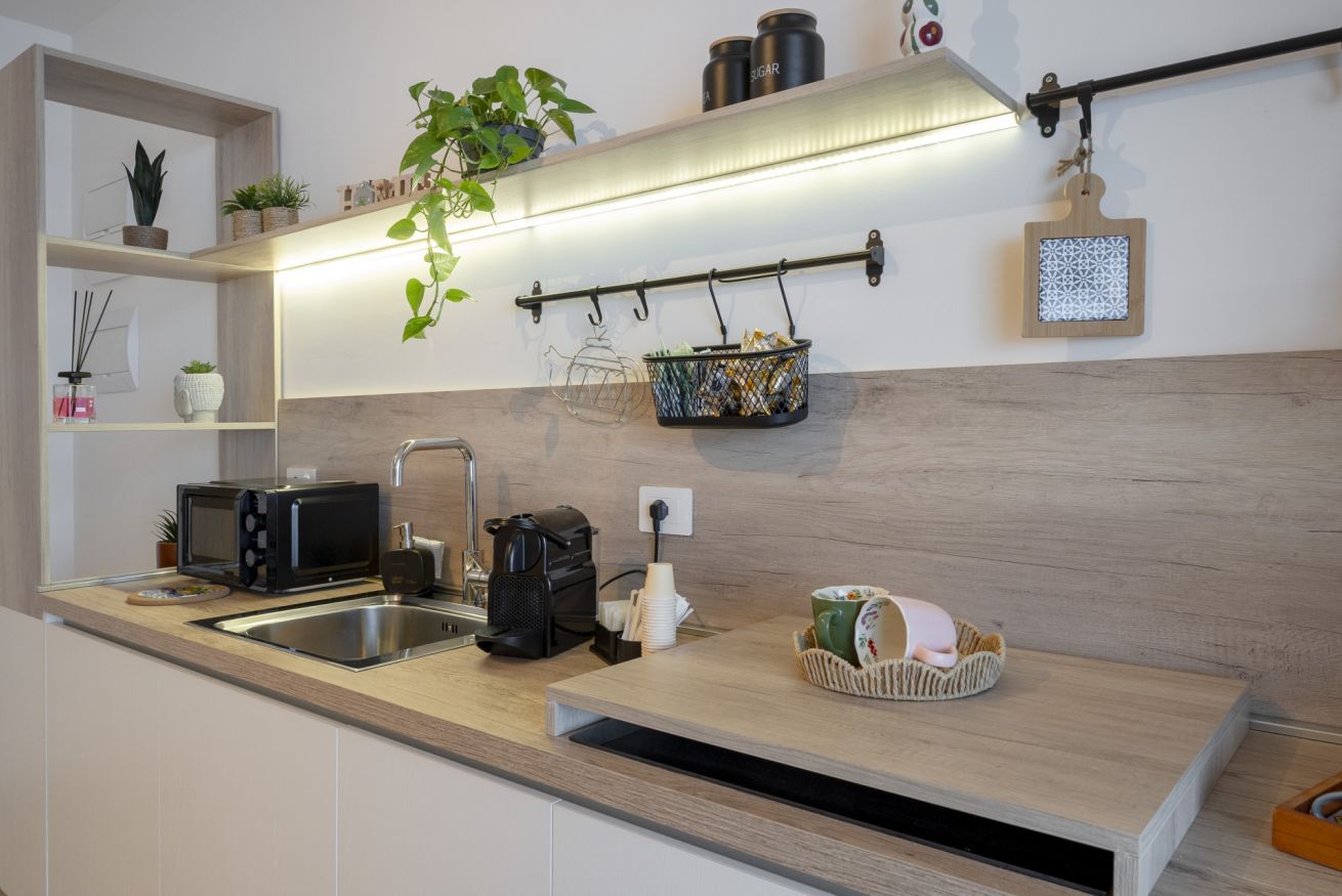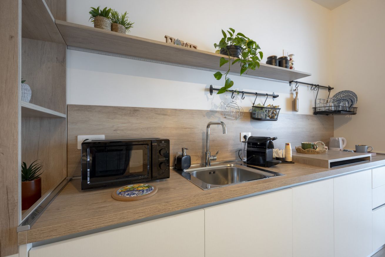 The fully equipped kitchen is modern and practical, providing everything you need to prepare breakfast, quick snacks, or simple dinners with ease. Clean lines and contemporary finishes make cooking here both simple and enjoyable.