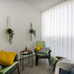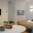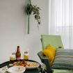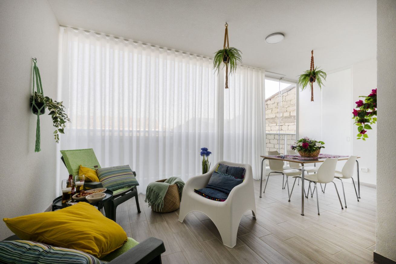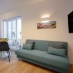The apartment features a spacious open-plan living area where natural light fills the space, creating a welcoming atmosphere for rest or quiet moments. The cozy sofa area is ideal for relaxing after a day of exploring, while the dining space offers a comfortable spot for enjoying meals at home.