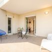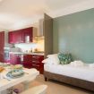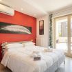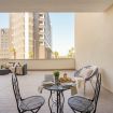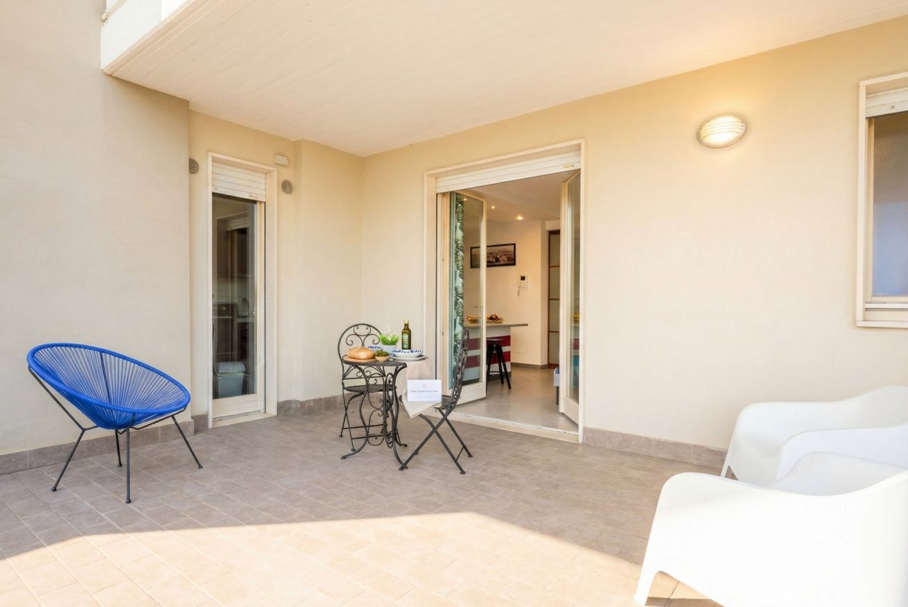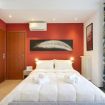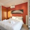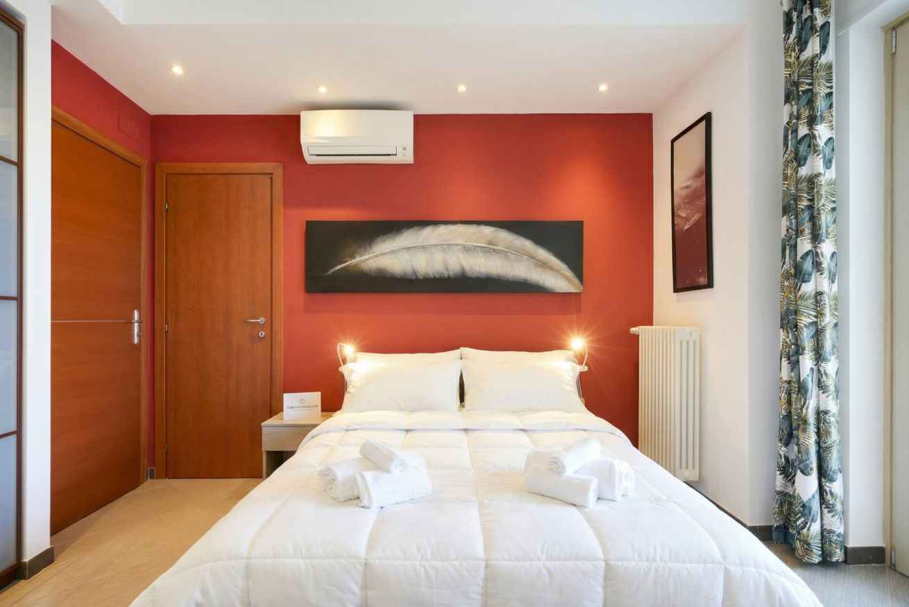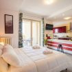 L’ambiente open space ruota attorno a un comodo letto imbottito con biancheria blu, valorizzato da una parete rossa d’effetto e da raffinati dettagli decorativi. La luce naturale inonda l’appartamento e conduce a una spaziosa terrazza privata coperta, un vero angolo di relax. Qui potrai gustare un caffè al mattino o rilassarti ammirando la vista urbana.