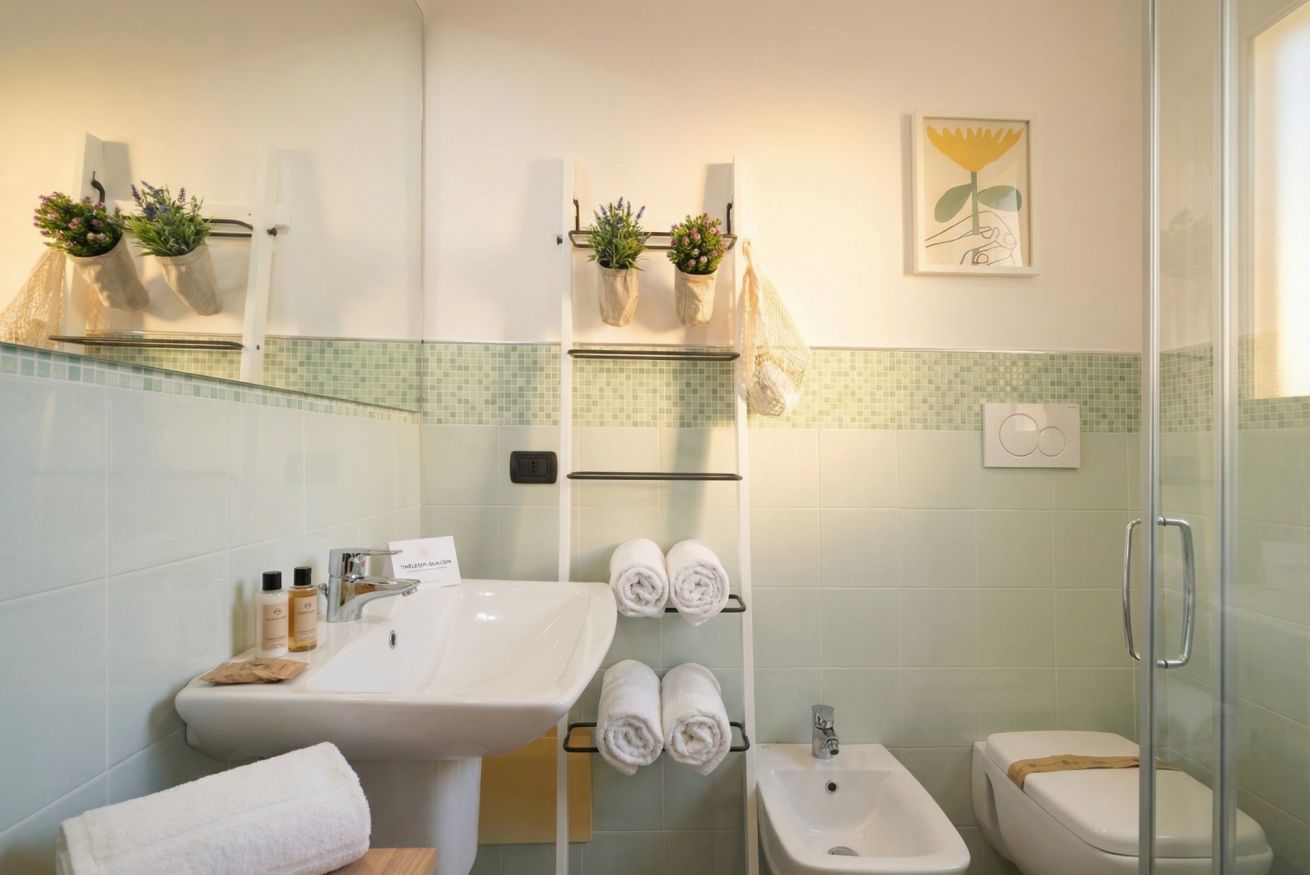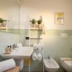 Il bagno, luminoso e moderno, presenta piastrelle verde chiaro, dettagli a mosaico e un’atmosfera fresca arricchita da elementi naturali.