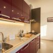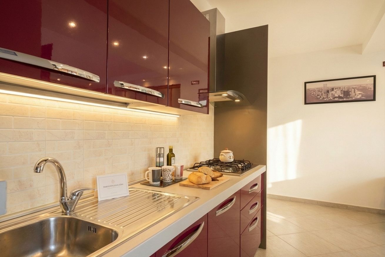 La cucina compatta è un elemento di design, con mobili lucidi color bordeaux, isola a righe rosso-bianco e una vivace parete turchese. È completamente attrezzata con elettrodomestici moderni e una pratica zona pranzo.