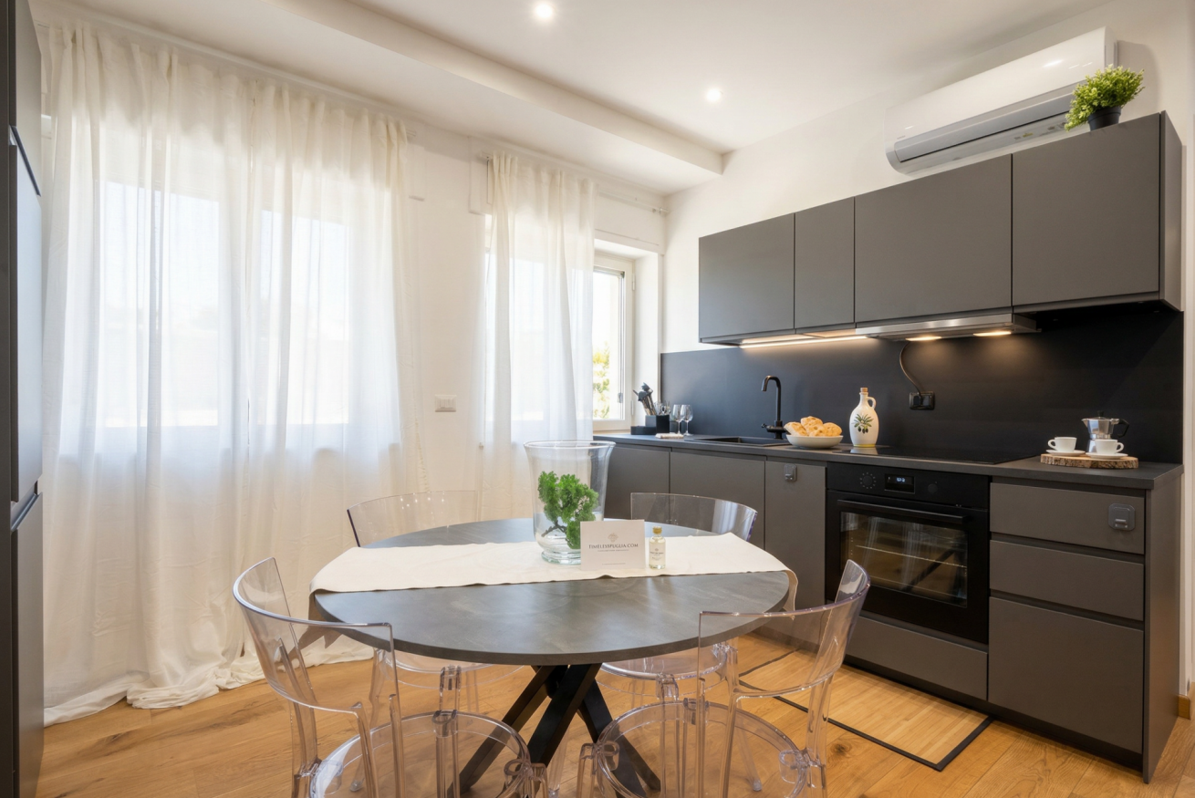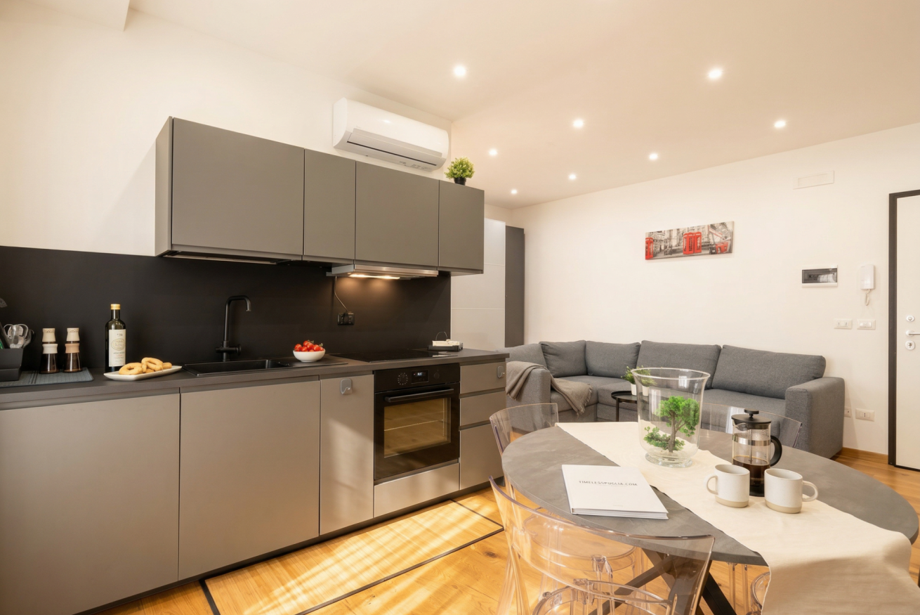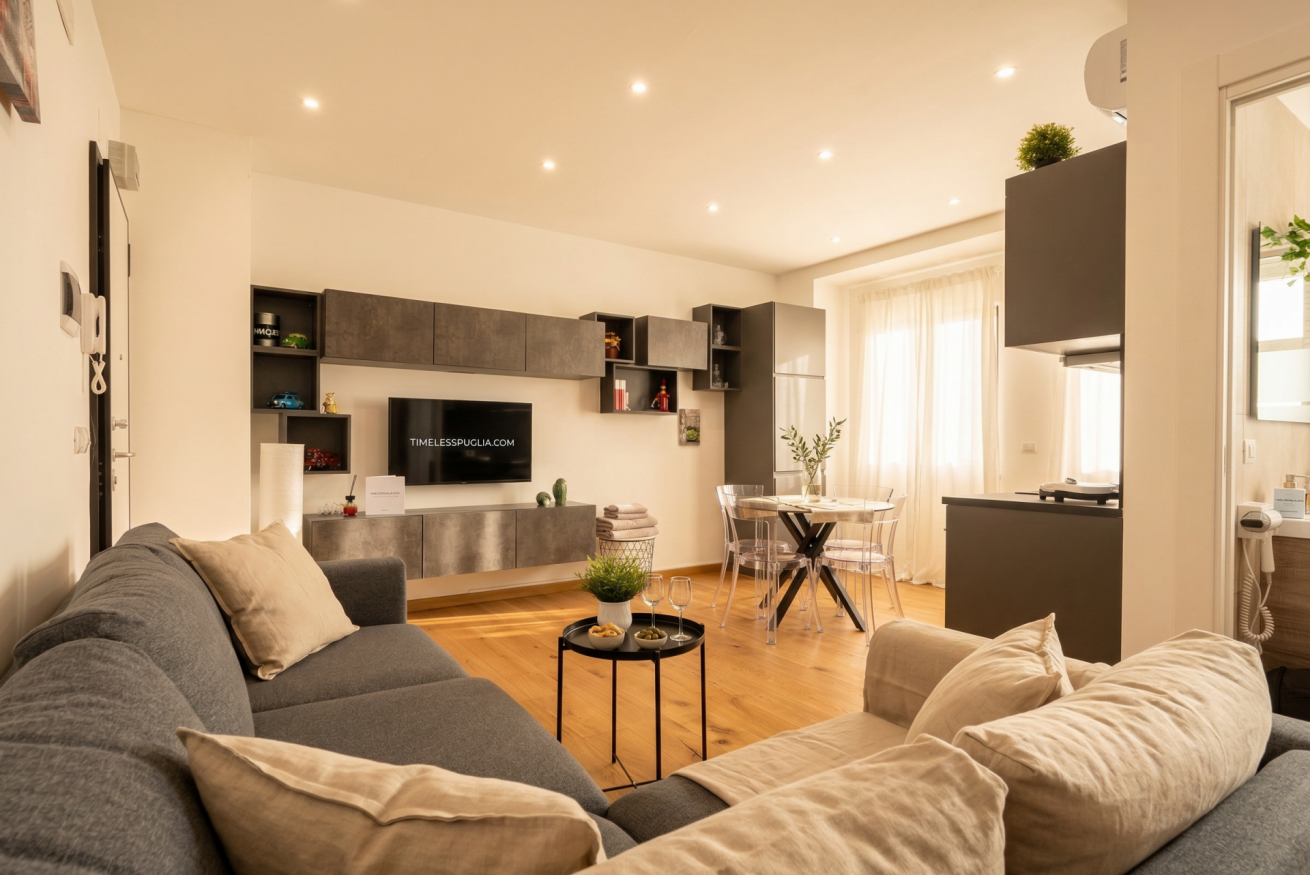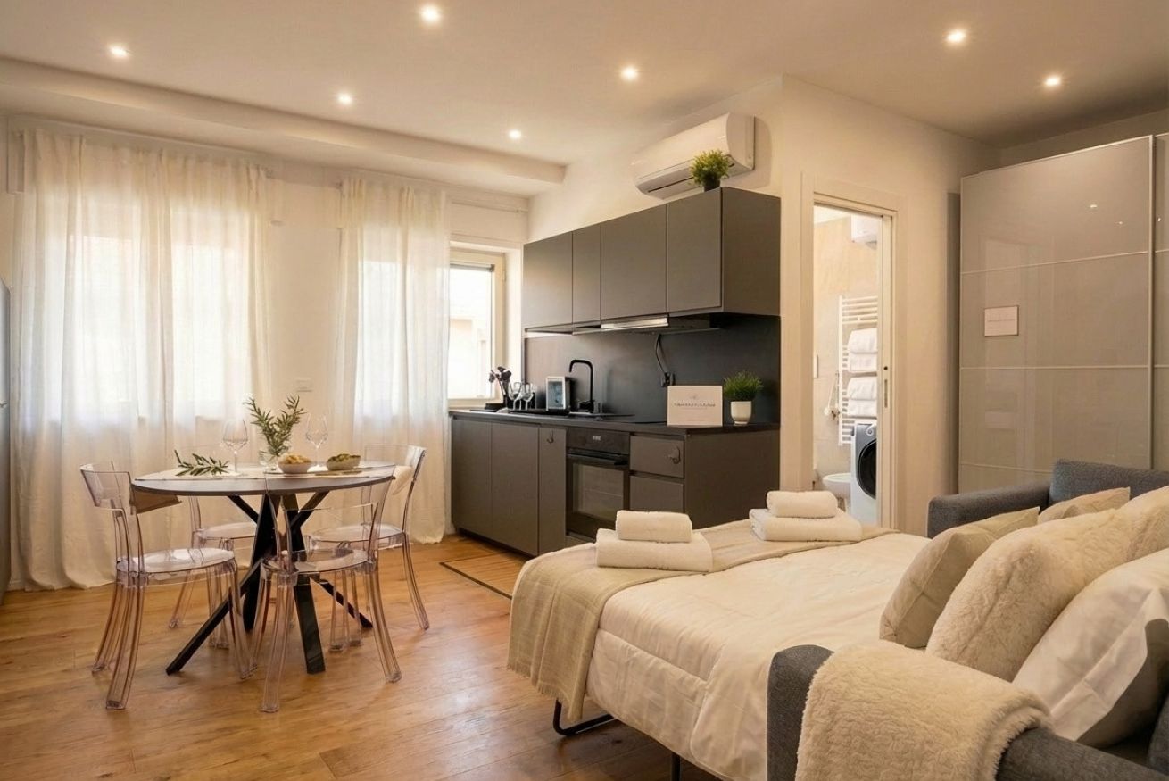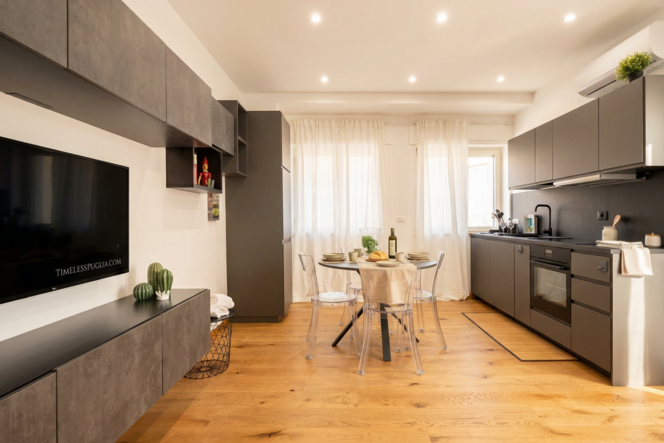 Experience the perfect urban retreat at Sparano Mood 170, a beautifully curated studio apartment located in the heart of Bari. This modern, first-floor residence offers a refined atmosphere, combining sleek design with the warmth of high-end materials. As you step inside, you are welcomed by an inviting open-plan layout that maximizes space and comfort. The living area features stunning light oak hardwood floors, recessed ceiling lighting, and contemporary grey furnishings, including a plush sofa bed with fresh, high-quality linens. A touch of personality is added by the distinct London-themed artwork, giving the space a unique and cosmopolitan character. The kitchen is a chef’s delight, outfitted with matte charcoal cabinetry and a full suite of modern appliances, including an integrated oven, induction hob, and refrigerator. It seamlessly flows into the dining area, where a sophisticated round table paired with iconic ghost chairs invites you to enjoy a morning coffee or a quiet evening meal. Every detail has been considered to ensure a relaxing stay, from the high-speed WiFi and air conditioning to the inclusion of a washing machine for your convenience. The bathroom is a true sanctuary, featuring warm, beige stone-look ceramic tiles, a modern glass-enclosed shower, and a wooden vanity cabinet accented with tasteful greenery. You will find all the essentials provided, including toiletries, a hairdryer, and plush towels for a spa-like experience. Located just a short distance from the city center, this home serves as the perfect base for your Italian adventures, allowing you to easily explore Bari’s rich culture, renowned restaurants, and historic streets. With seamless self check-in via secure key lockboxes, your arrival will be as smooth as your stay. Whether you are traveling for business or pleasure, the home offers an unparalleled combination of elegance, functionality, and central convenience that will make your visit to Italy truly memorable.