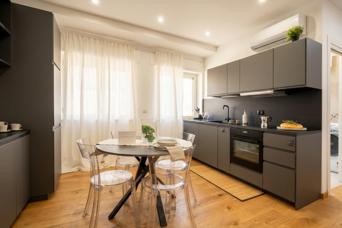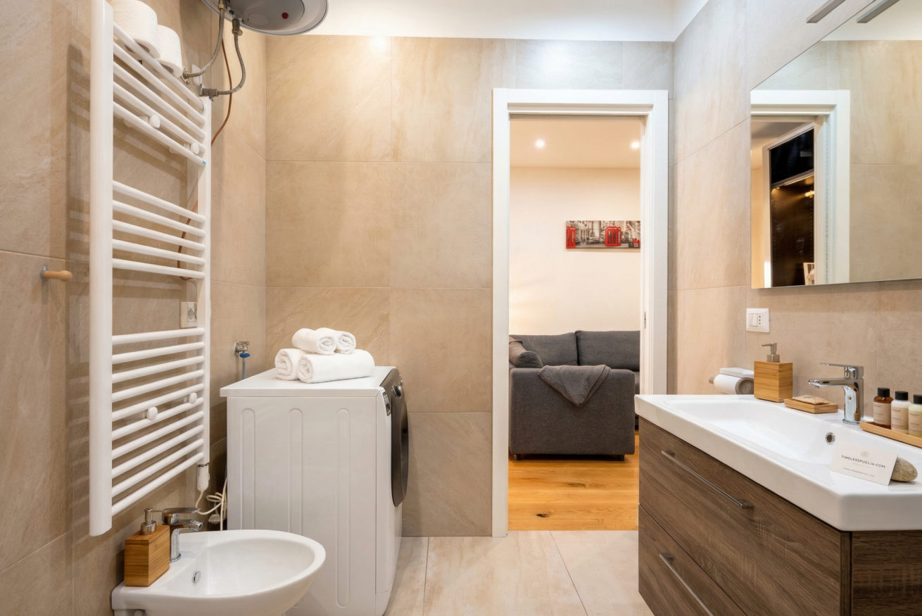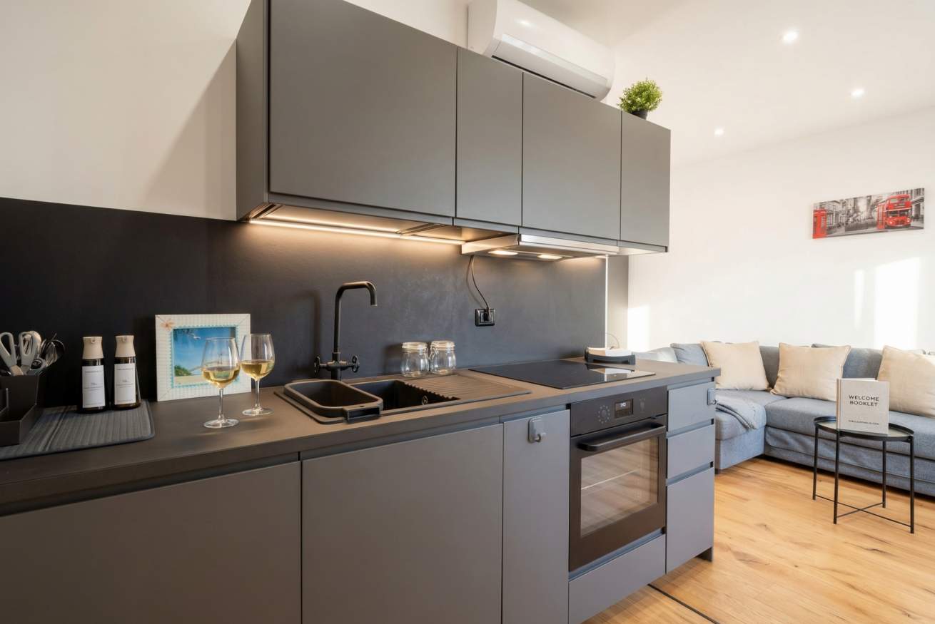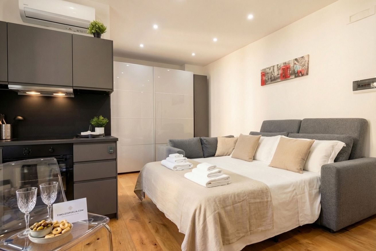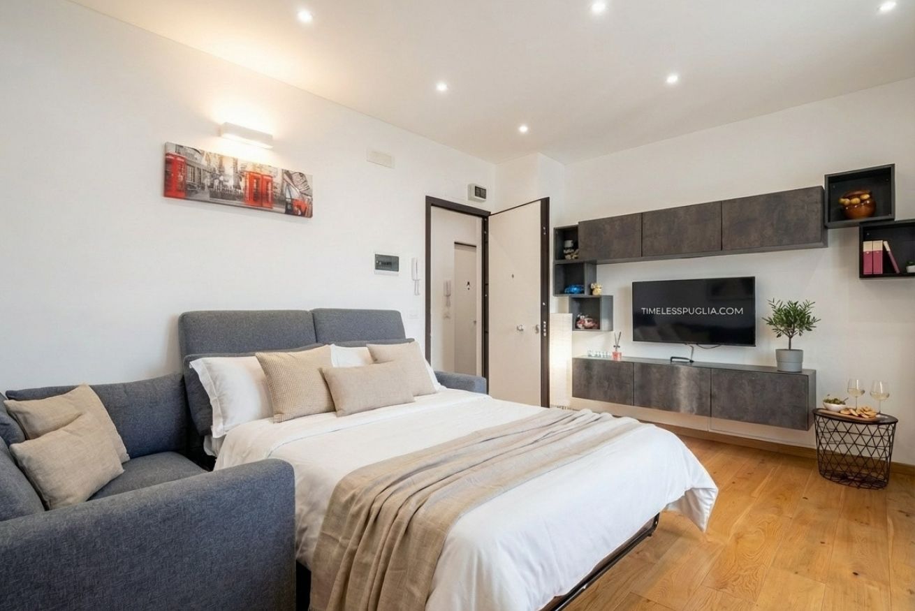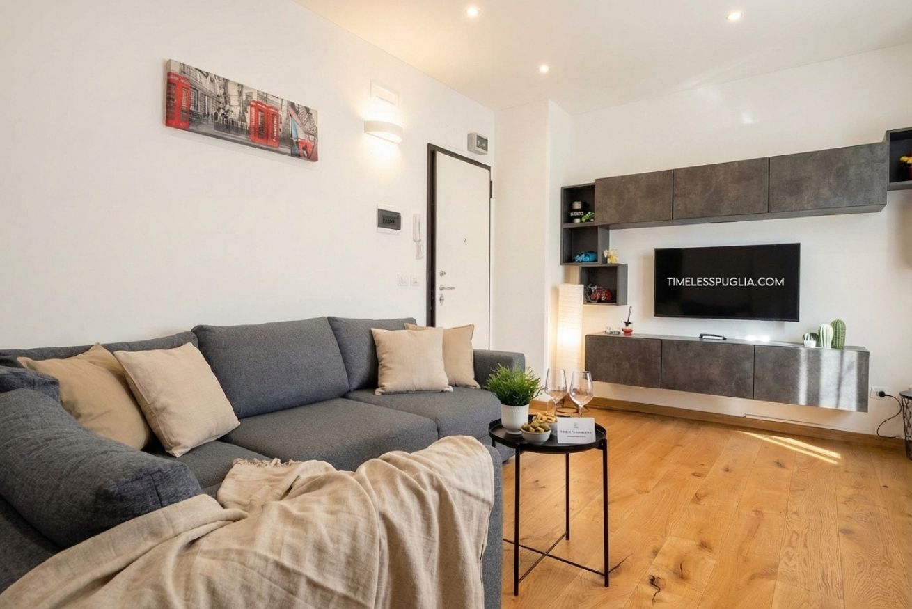 Experience the perfect urban retreat at Sparano Mood 170, a beautifully curated studio apartment located in the heart of Bari. This modern, first-floor residence offers a refined atmosphere, combining sleek design with the warmth of high-end materials. As you step inside, you are welcomed by an inviting open-plan layout that maximizes space and comfort. The living area features stunning light oak hardwood floors, recessed ceiling lighting, and contemporary grey furnishings, including a plush sofa bed with fresh, high-quality linens. A touch of personality is added by the distinct London-themed artwork, giving the space a unique and cosmopolitan character. The kitchen is a chef’s delight, outfitted with matte charcoal cabinetry and a full suite of modern appliances, including an integrated oven, induction hob, and refrigerator. It seamlessly flows into the dining area, where a sophisticated round table paired with iconic ghost chairs invites you to enjoy a morning coffee or a quiet evening meal. Every detail has been considered to ensure a relaxing stay, from the high-speed WiFi and air conditioning to the inclusion of a washing machine for your convenience. The bathroom is a true sanctuary, featuring warm, beige stone-look ceramic tiles, a modern glass-enclosed shower, and a wooden vanity cabinet accented with tasteful greenery. You will find all the essentials provided, including toiletries, a hairdryer, and plush towels for a spa-like experience. Located just a short distance from the city center, this home serves as the perfect base for your Italian adventures, allowing you to easily explore Bari’s rich culture, renowned restaurants, and historic streets. With seamless self check-in via secure key lockboxes, your arrival will be as smooth as your stay. Whether you are traveling for business or pleasure, the home offers an unparalleled combination of elegance, functionality, and central convenience that will make your visit to Italy truly memorable.