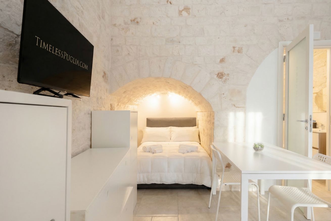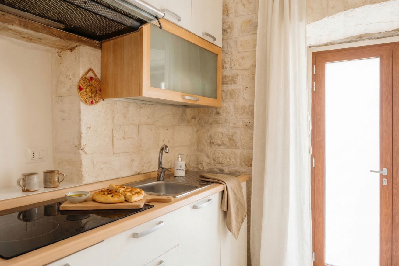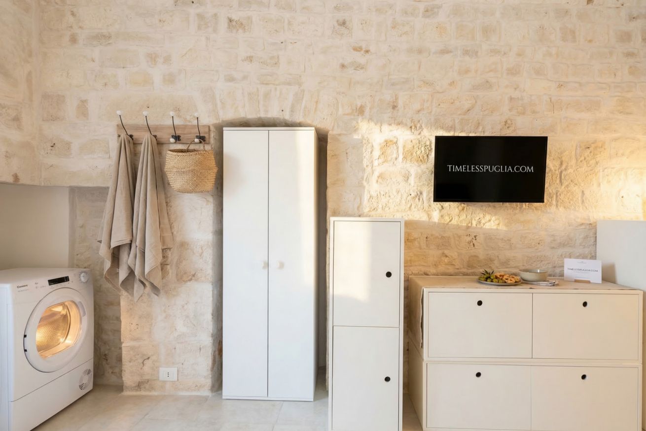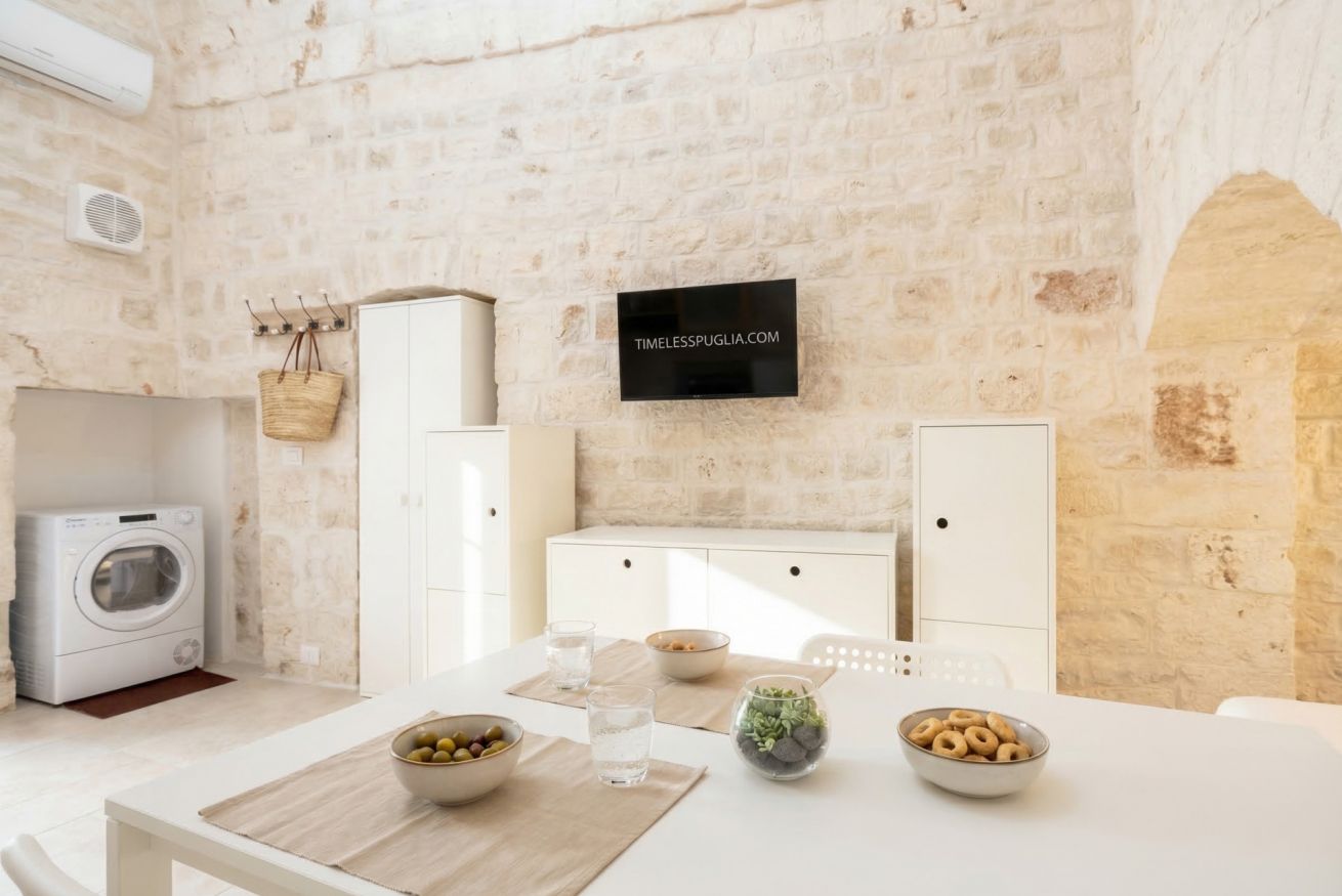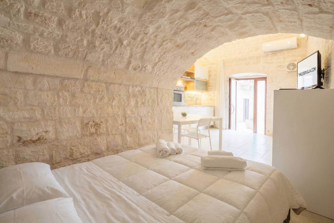 Experience the timeless allure of Puglia at Casa Nathan, a beautifully curated retreat nestled in the historic heart of Casamassima. This unique studio property captures the essence of traditional Italian architecture, defined by dramatic, high barrel-vaulted stone ceilings and authentic, raw-hewn limestone walls that whisper stories of the past. Expertly renovated to meet modern standards of luxury, the space balances rustic character with a minimalist, clean aesthetic. The open-plan layout is thoughtfully designed to maximize comfort, featuring a cozy bedroom alcove with a plush grey upholstered bed that promises a restful night. The sleek kitchen area, finished in crisp white with light wood accents, is fully equipped with high-end stainless steel appliances, including an integrated oven and induction cooktop, perfect for preparing a local meal. The bathroom is a true sanctuary, showcasing elegant marble-effect tiling and a glass-enclosed shower, all tucked beneath a stunning original stone vault. For your convenience, the property includes modern amenities such as a dedicated washing machine and tumble dryer, high-speed WiFi, and air conditioning to ensure your comfort regardless of the season. Situated just 0.37km from the vibrant town center, you are ideally positioned to explore the winding streets, charming local eateries, and authentic culture that make this region so special. Every detail, from the soft recessed lighting to the modern, minimalist storage solutions, has been considered to create an atmosphere of tranquility and refined relaxation. Whether you are seeking a romantic hideaway or a peaceful base to discover the breathtaking landscapes of Bari and beyond, this property offers an unparalleled experience. Immerse yourself in the sophisticated comfort of a home that honors its heritage while providing every contemporary convenience required for a memorable stay in beautiful Italy.
