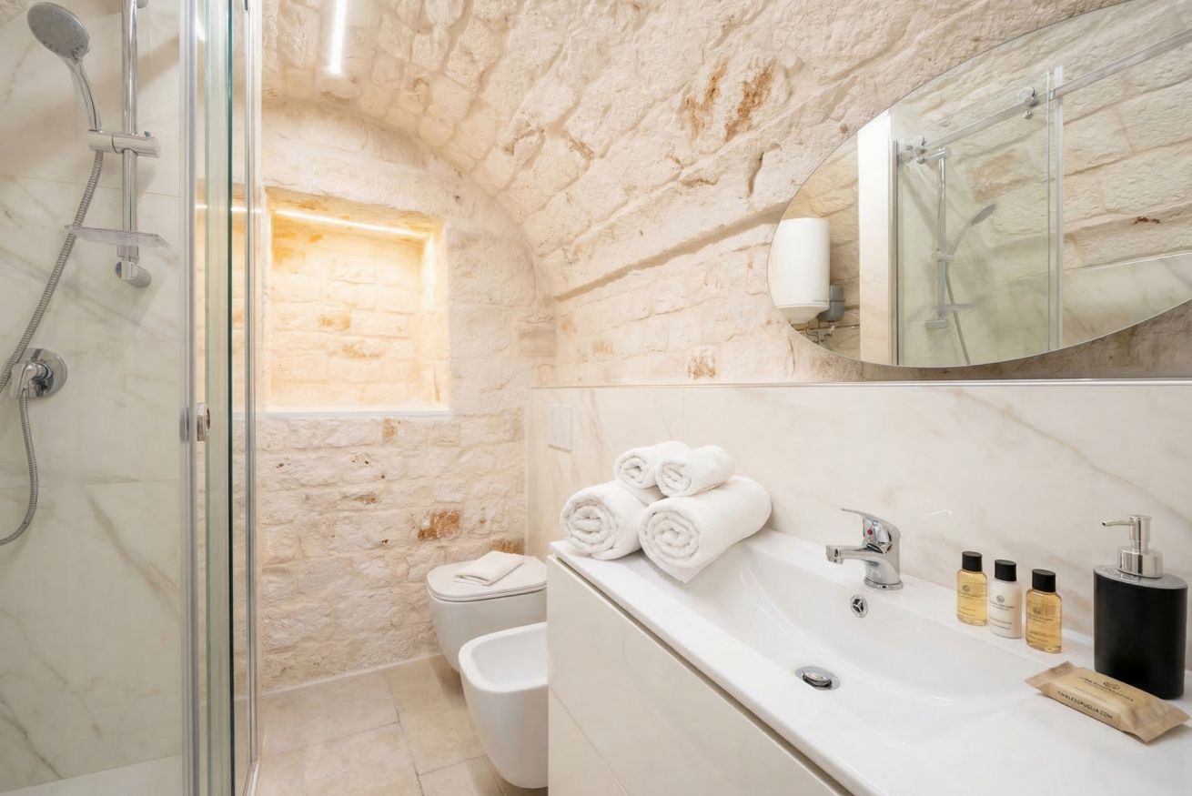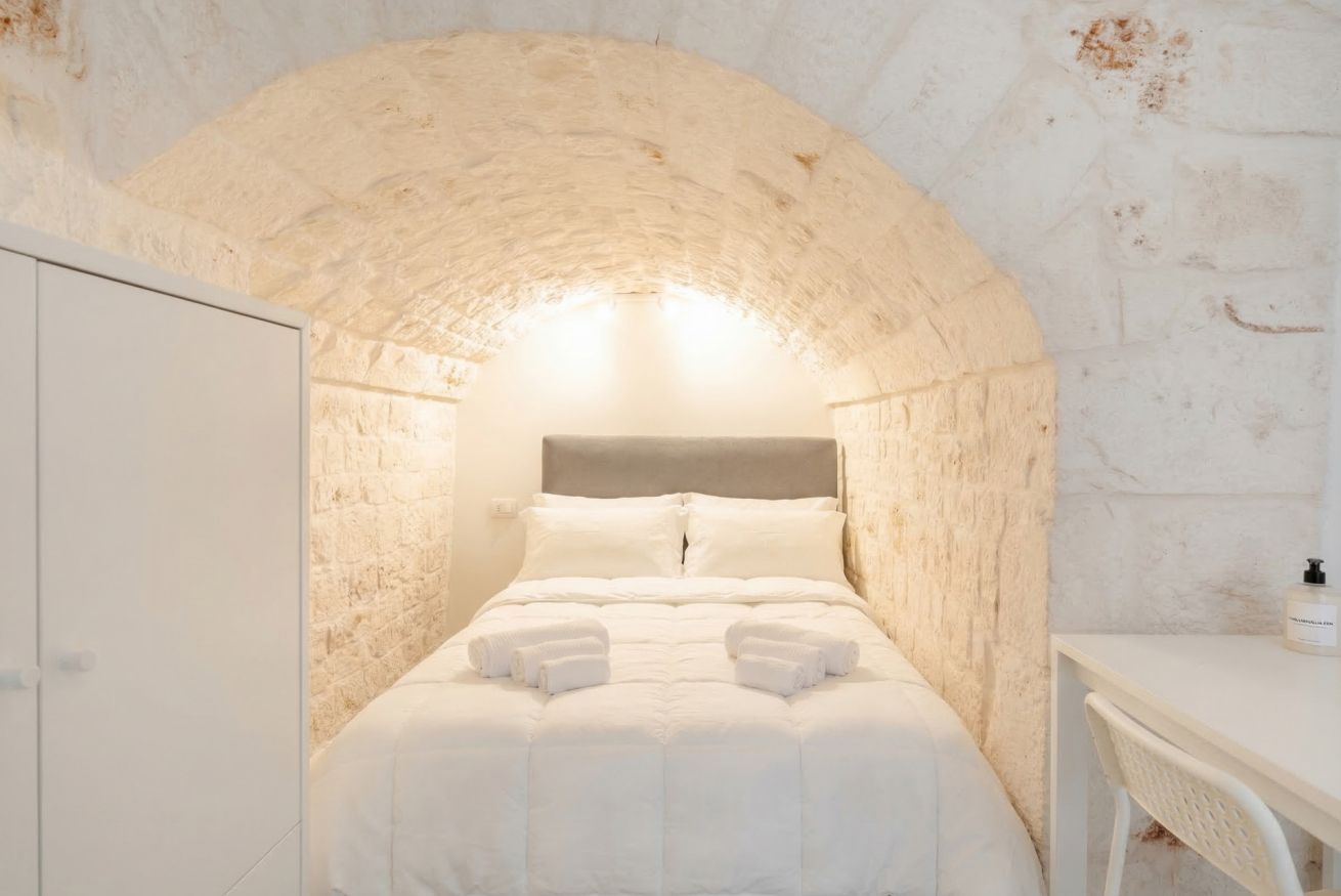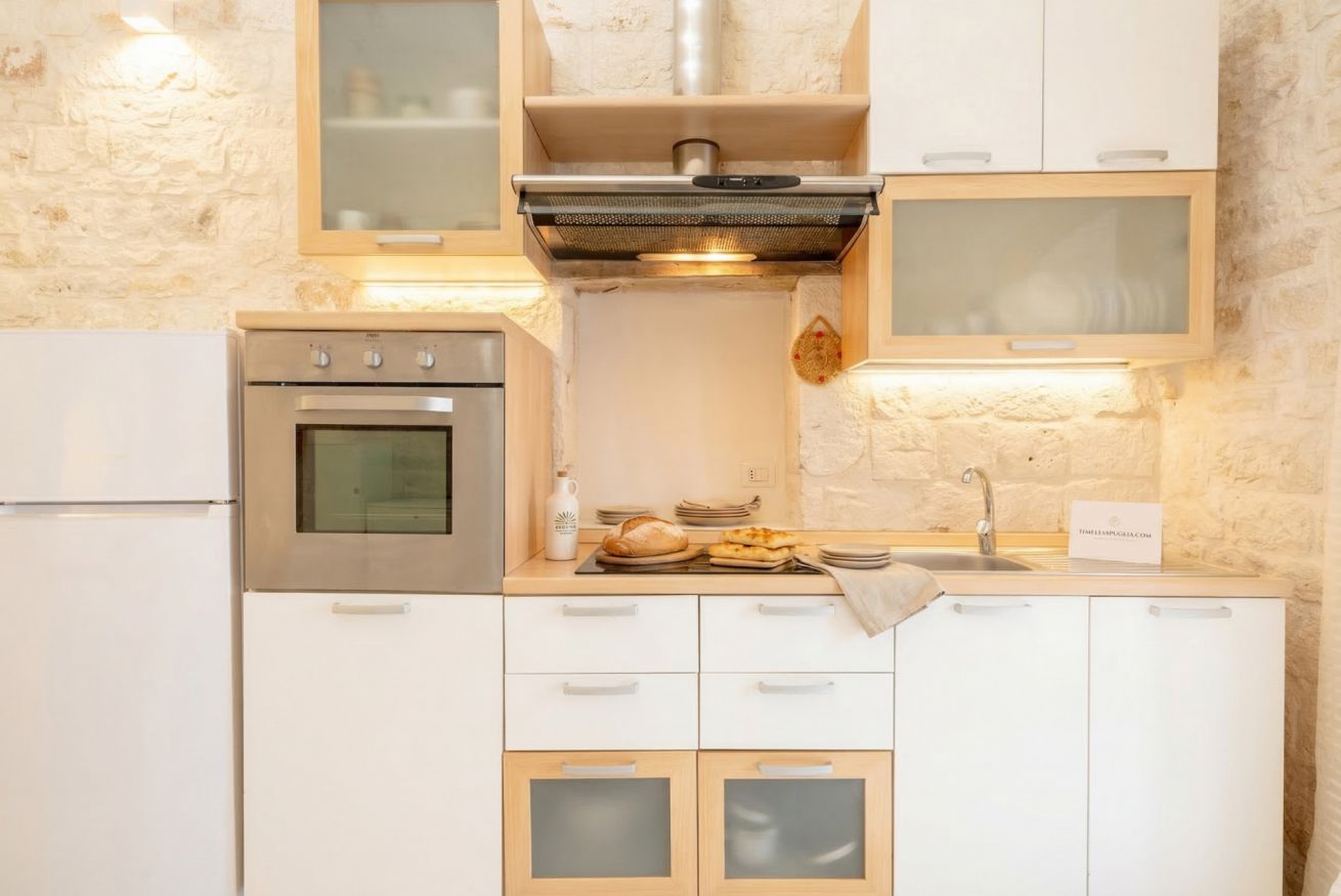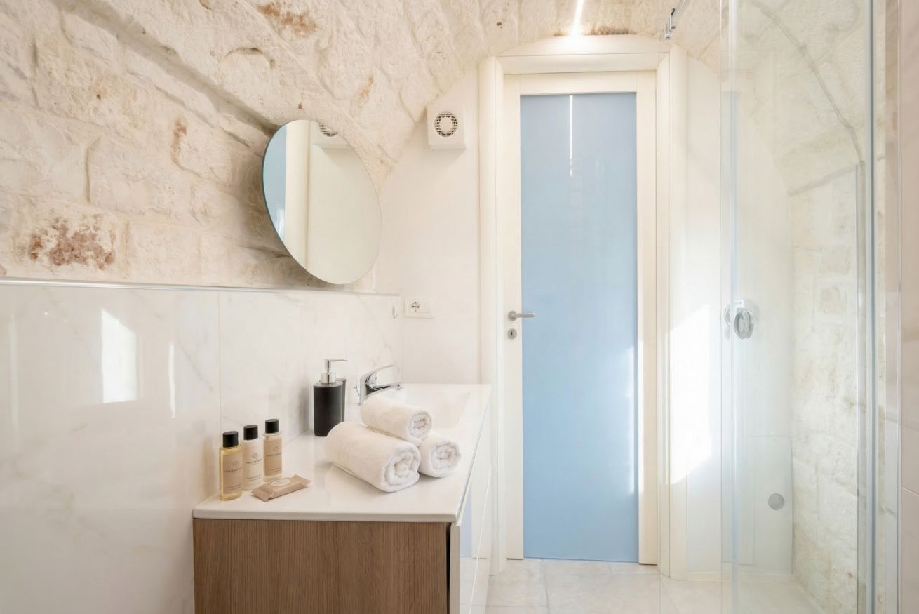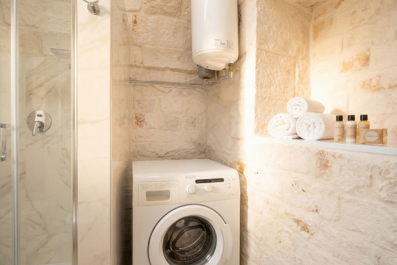 Experience the timeless allure of Puglia at Casa Nathan, a beautifully curated retreat nestled in the historic heart of Casamassima. This unique studio property captures the essence of traditional Italian architecture, defined by dramatic, high barrel-vaulted stone ceilings and authentic, raw-hewn limestone walls that whisper stories of the past. Expertly renovated to meet modern standards of luxury, the space balances rustic character with a minimalist, clean aesthetic. The open-plan layout is thoughtfully designed to maximize comfort, featuring a cozy bedroom alcove with a plush grey upholstered bed that promises a restful night. The sleek kitchen area, finished in crisp white with light wood accents, is fully equipped with high-end stainless steel appliances, including an integrated oven and induction cooktop, perfect for preparing a local meal. The bathroom is a true sanctuary, showcasing elegant marble-effect tiling and a glass-enclosed shower, all tucked beneath a stunning original stone vault. For your convenience, the property includes modern amenities such as a dedicated washing machine and tumble dryer, high-speed WiFi, and air conditioning to ensure your comfort regardless of the season. Situated just 0.37km from the vibrant town center, you are ideally positioned to explore the winding streets, charming local eateries, and authentic culture that make this region so special. Every detail, from the soft recessed lighting to the modern, minimalist storage solutions, has been considered to create an atmosphere of tranquility and refined relaxation. Whether you are seeking a romantic hideaway or a peaceful base to discover the breathtaking landscapes of Bari and beyond, this property offers an unparalleled experience. Immerse yourself in the sophisticated comfort of a home that honors its heritage while providing every contemporary convenience required for a memorable stay in beautiful Italy.