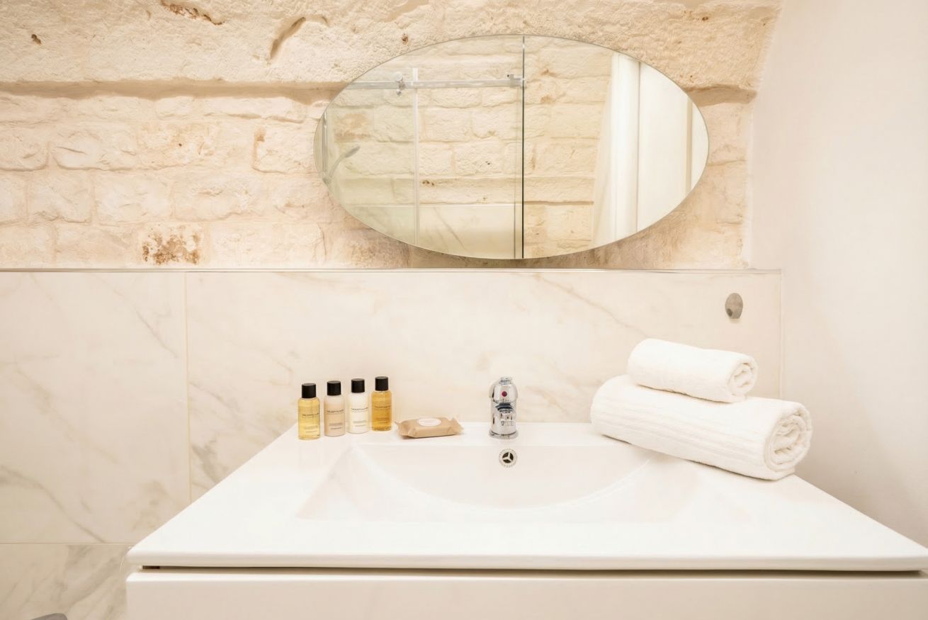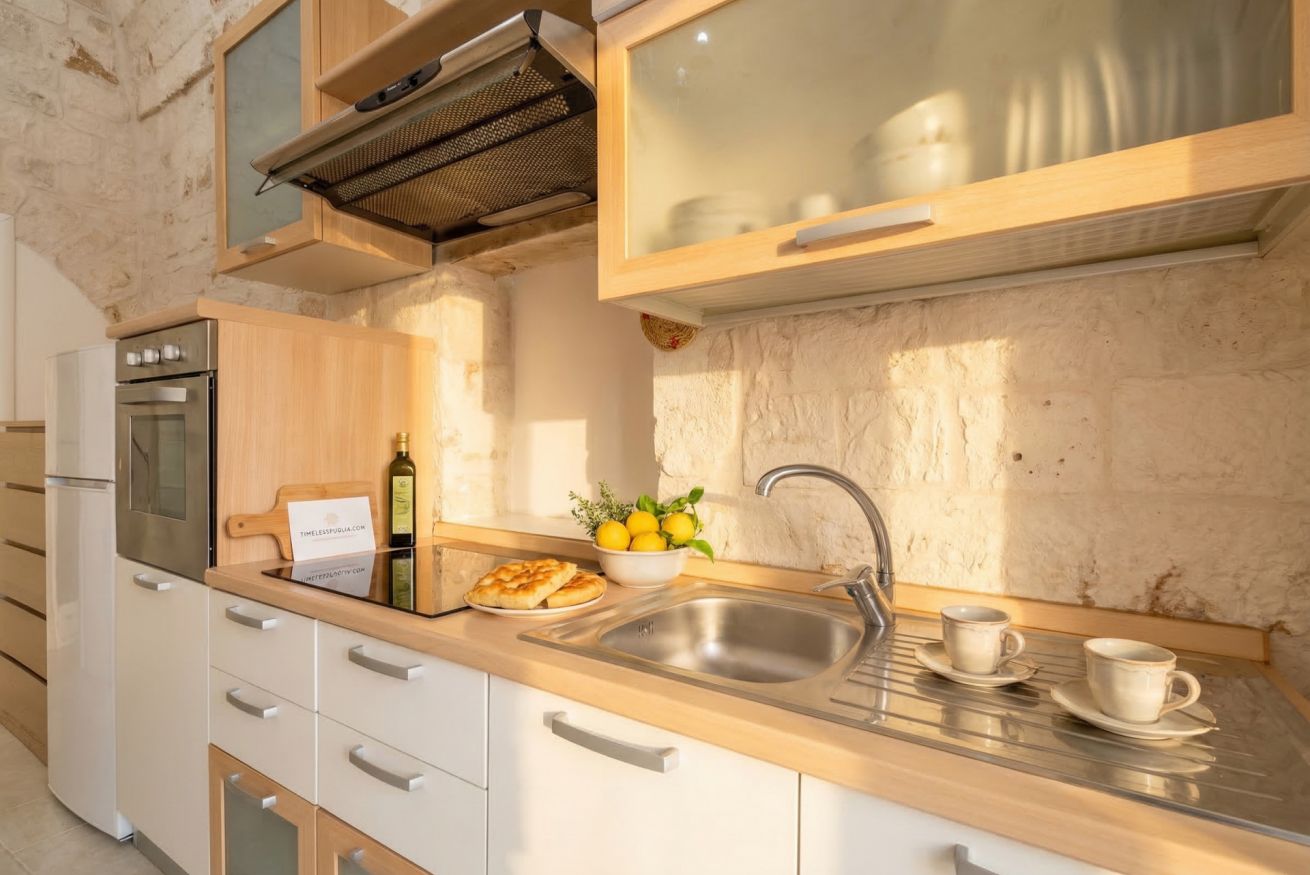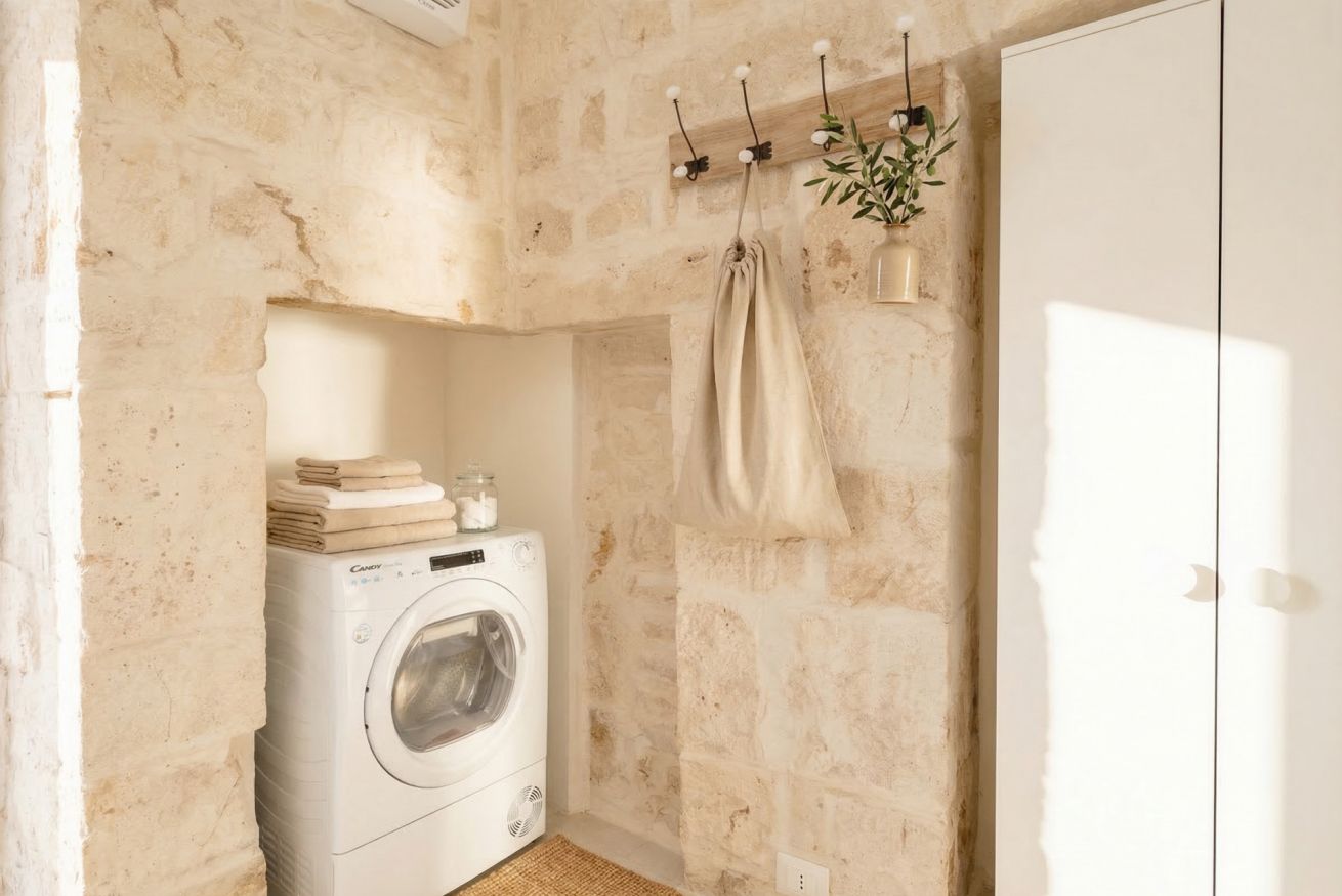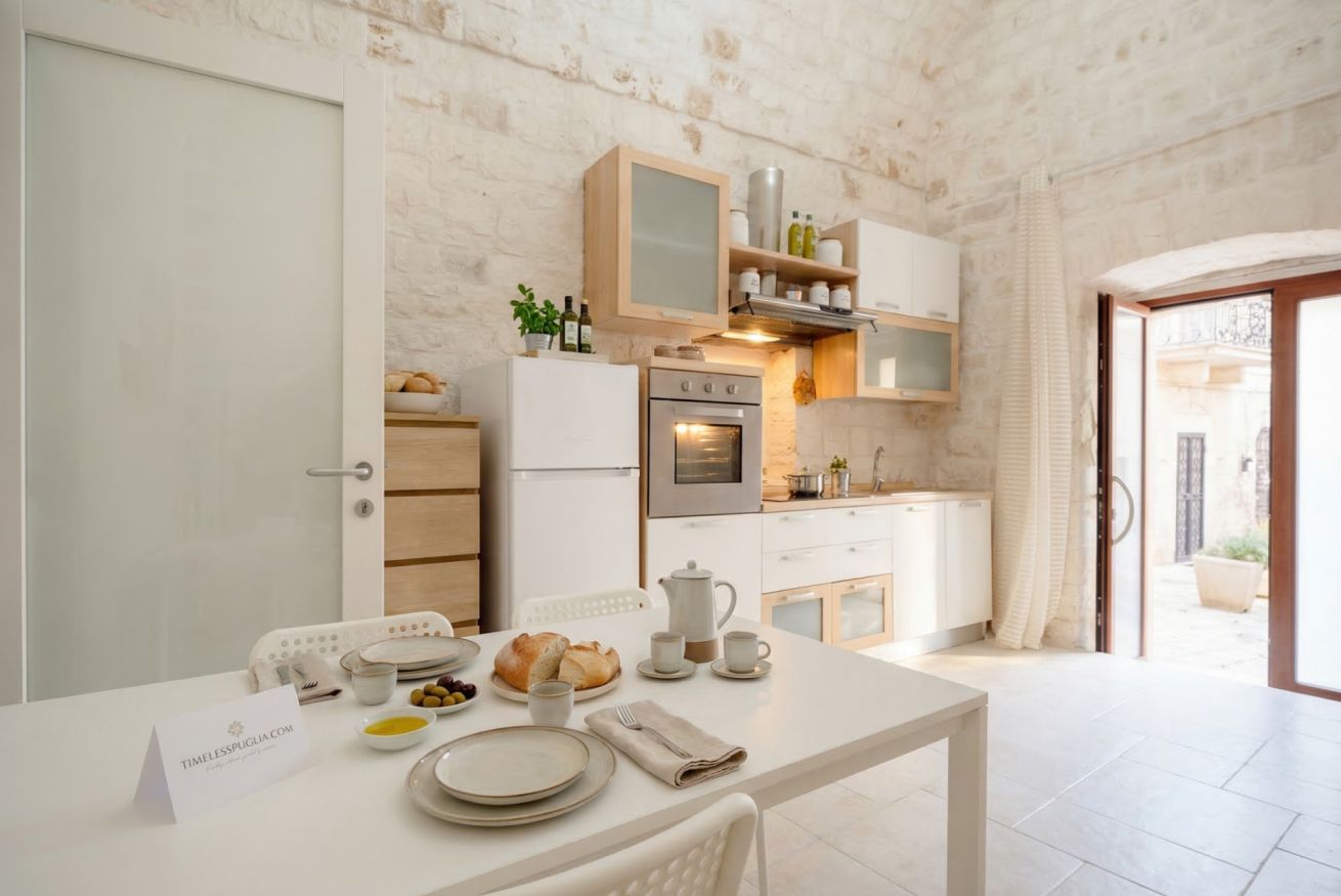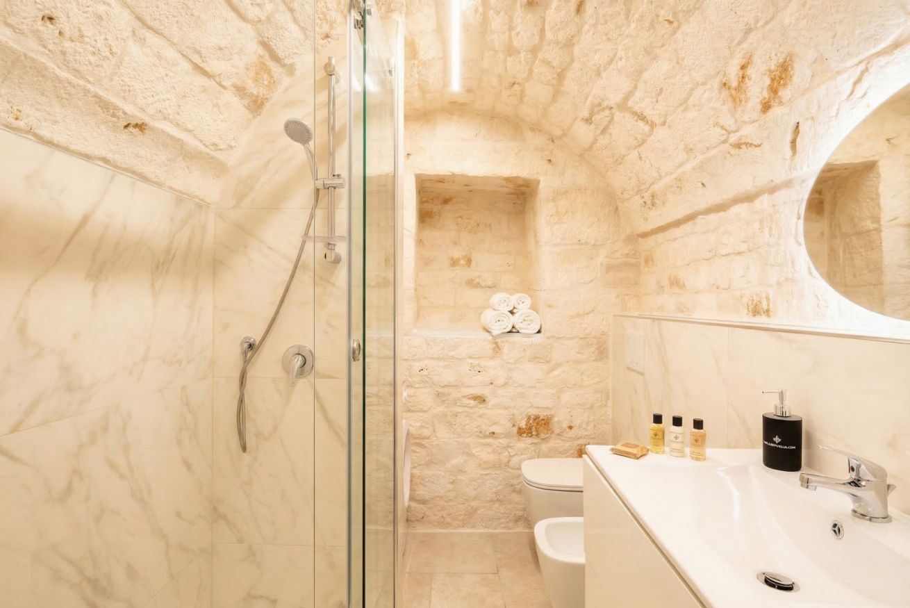 Experience the timeless allure of Puglia at Casa Nathan, a beautifully curated retreat nestled in the historic heart of Casamassima. This unique studio property captures the essence of traditional Italian architecture, defined by dramatic, high barrel-vaulted stone ceilings and authentic, raw-hewn limestone walls that whisper stories of the past. Expertly renovated to meet modern standards of luxury, the space balances rustic character with a minimalist, clean aesthetic. The open-plan layout is thoughtfully designed to maximize comfort, featuring a cozy bedroom alcove with a plush grey upholstered bed that promises a restful night. The sleek kitchen area, finished in crisp white with light wood accents, is fully equipped with high-end stainless steel appliances, including an integrated oven and induction cooktop, perfect for preparing a local meal. The bathroom is a true sanctuary, showcasing elegant marble-effect tiling and a glass-enclosed shower, all tucked beneath a stunning original stone vault. For your convenience, the property includes modern amenities such as a dedicated washing machine and tumble dryer, high-speed WiFi, and air conditioning to ensure your comfort regardless of the season. Situated just 0.37km from the vibrant town center, you are ideally positioned to explore the winding streets, charming local eateries, and authentic culture that make this region so special. Every detail, from the soft recessed lighting to the modern, minimalist storage solutions, has been considered to create an atmosphere of tranquility and refined relaxation. Whether you are seeking a romantic hideaway or a peaceful base to discover the breathtaking landscapes of Bari and beyond, this property offers an unparalleled experience. Immerse yourself in the sophisticated comfort of a home that honors its heritage while providing every contemporary convenience required for a memorable stay in beautiful Italy.
