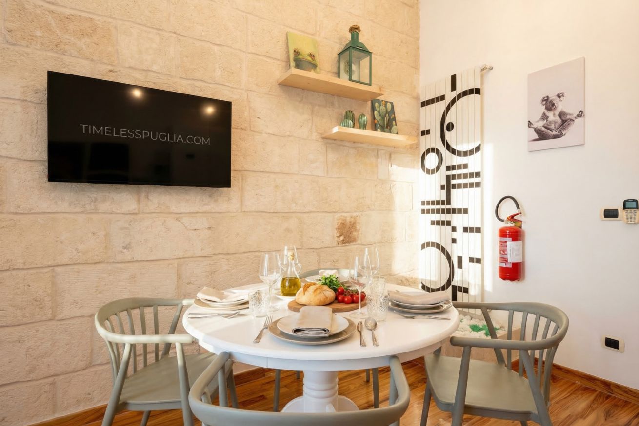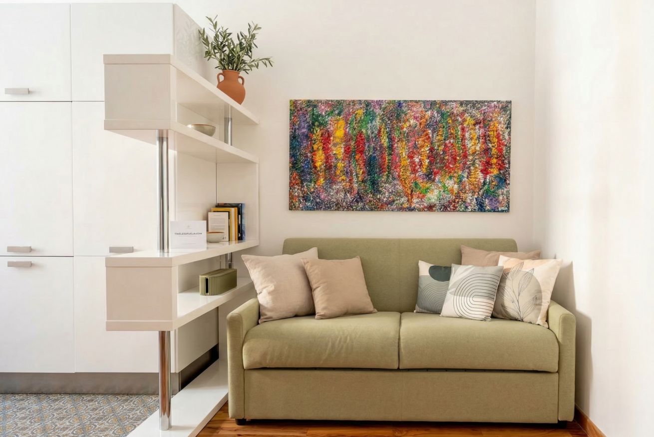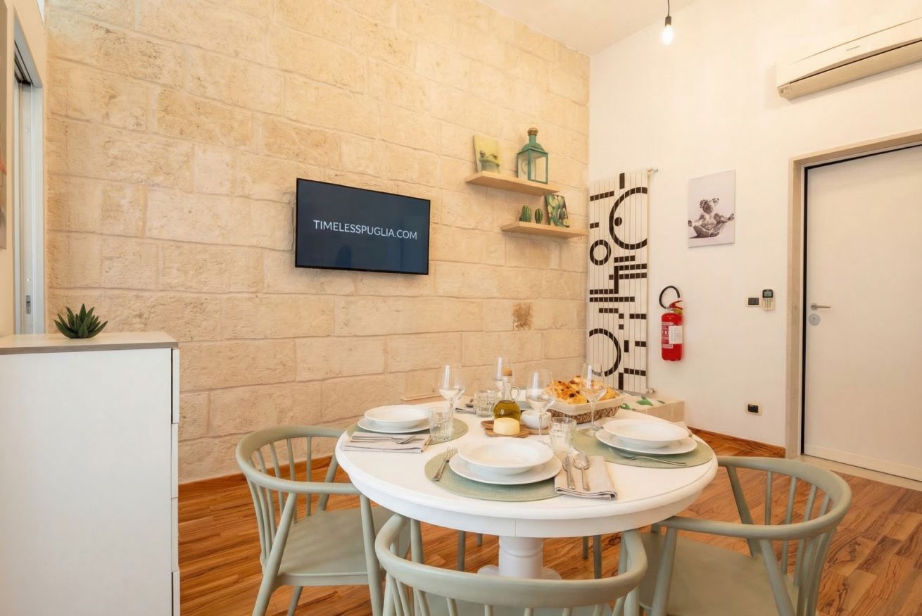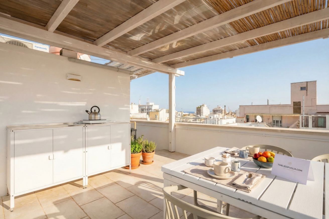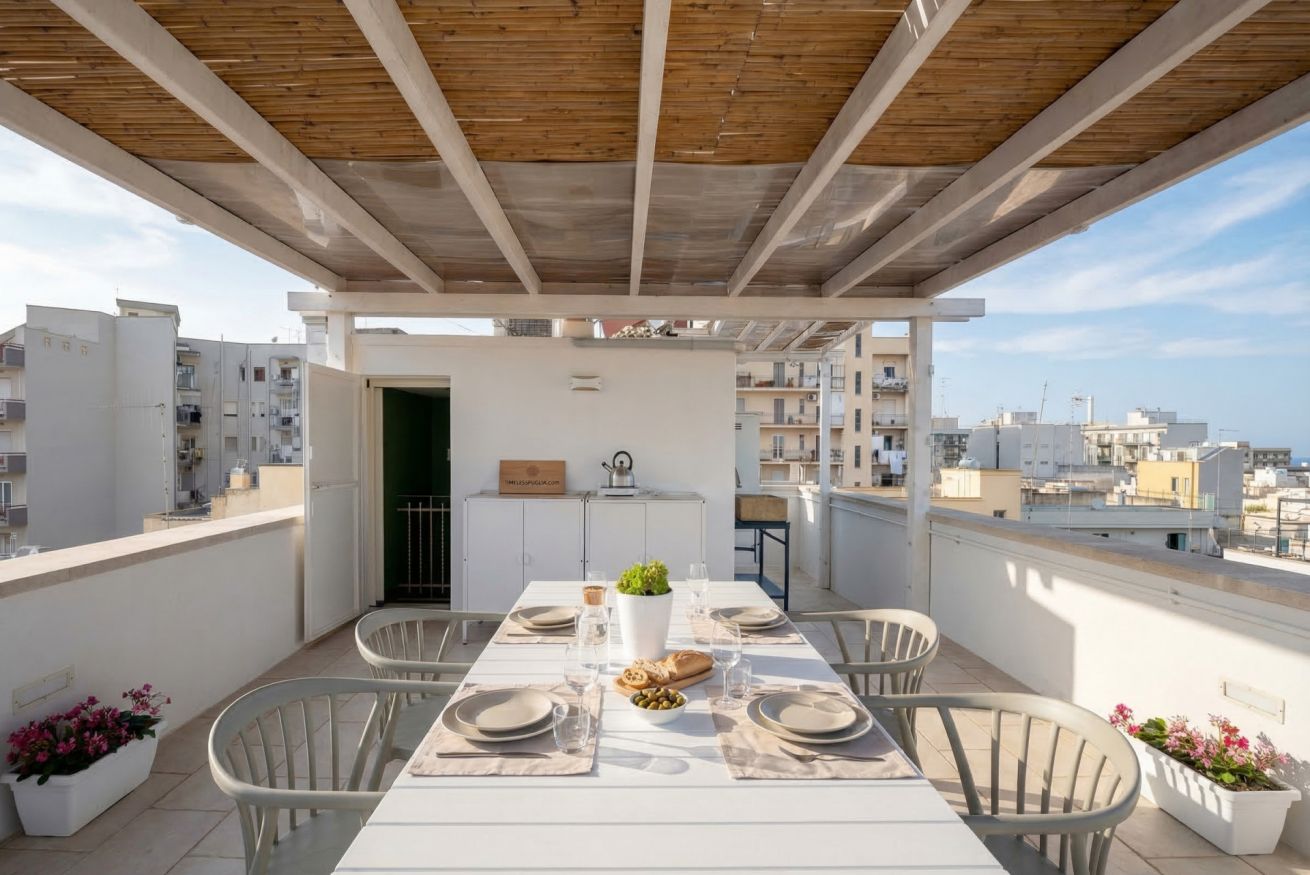 Experience the quintessential charm of Monopoli at Terrazza San Martino, an elegant one-bedroom apartment that perfectly captures the spirit of Puglia. Located on the first floor of a traditional building, this property serves as a sophisticated urban retreat designed for guests who appreciate thoughtful aesthetics and comfort. Upon entering, you are welcomed by an atmosphere of refined warmth, where historic exposed limestone walls meet sleek, modern high-gloss finishes and rich wooden flooring. The heart of the home is the open-plan living and dining area, featuring a sage green sofa bed and a round dining table that seats four, making it an ideal space to unwind after a day of exploration. The fully equipped modern kitchen, complete with a commercial-style faucet and artisanal patterned tile flooring, provides everything needed to prepare fresh Mediterranean meals. The bedroom is a tranquil oasis, highlighting a natural stone wall and soft, inviting linens, ensuring a peaceful night's rest. The bathroom is a true highlight of the home, boasting contemporary luxury through its blend of oversized matte grey tiles and authentic rustic stone, complete with a soothing bathtub-shower combination. The crown jewel of this residence is undoubtedly the expansive rooftop terrace. Shaded by a rustic bamboo pergola, this private outdoor sanctuary offers panoramic views of the city skyline, making it the perfect setting for morning coffee or sunset dinners under the stars. Adorned with vibrant flowering planter boxes and chic outdoor furniture, the terrace invites you to relax in the sun on provided loungers or enjoy al fresco dining in the crisp sea air. Every detail, from the vibrant abstract art to the carefully curated decor, has been chosen to provide a memorable stay. Whether you are walking through the narrow, picturesque streets of Monopoli or enjoying a quiet evening on your private terrace, this property offers a seamless blend of convenience and luxury