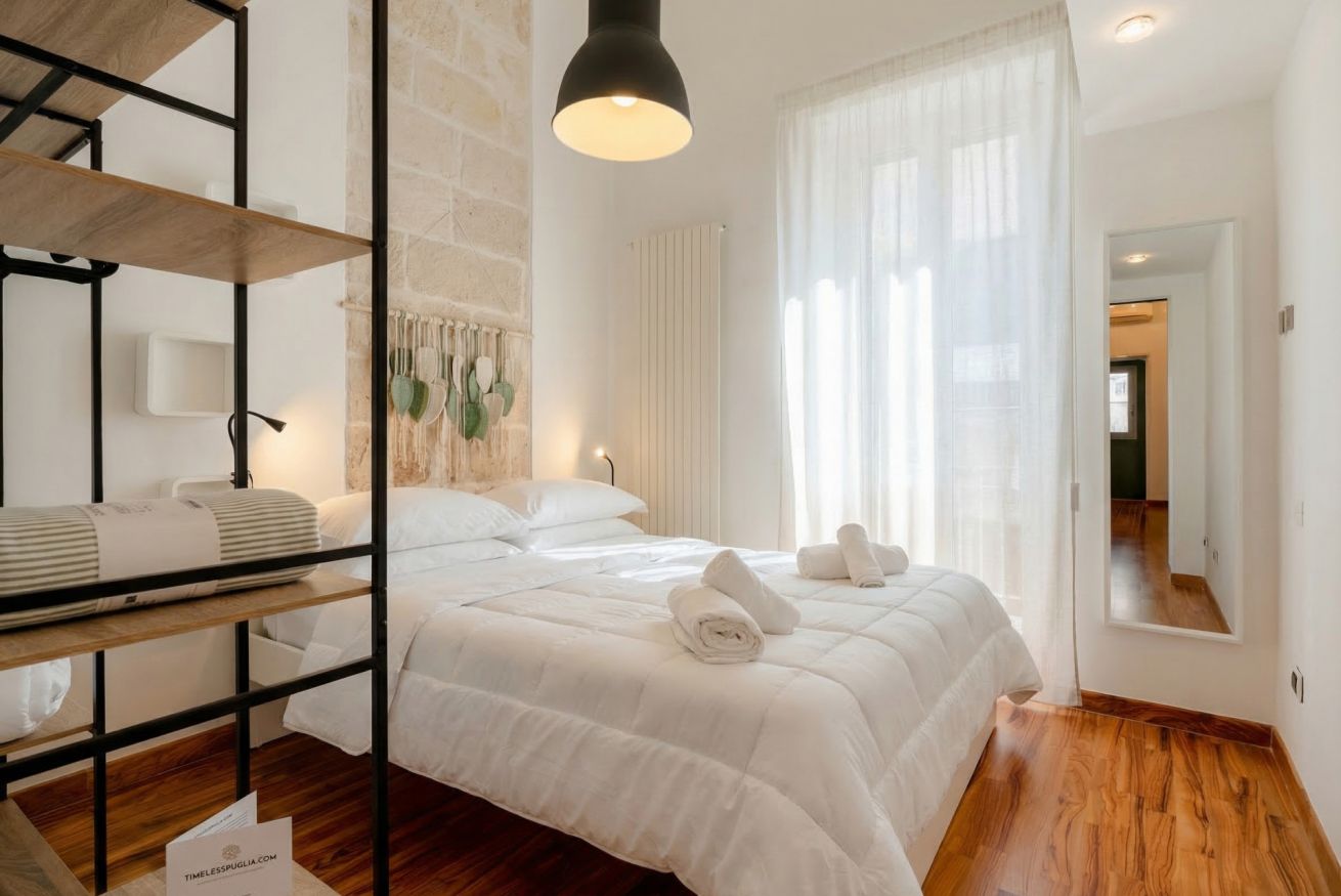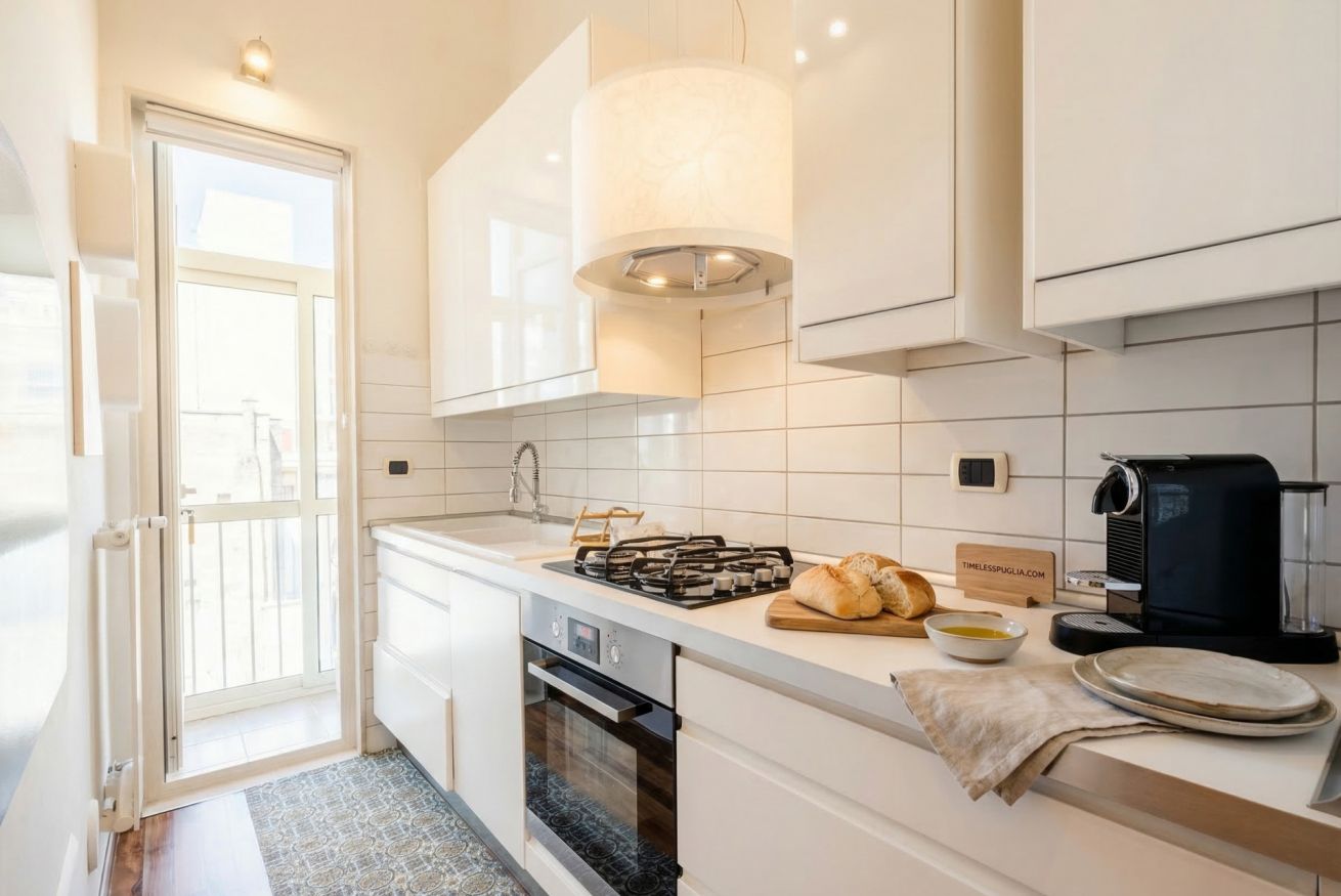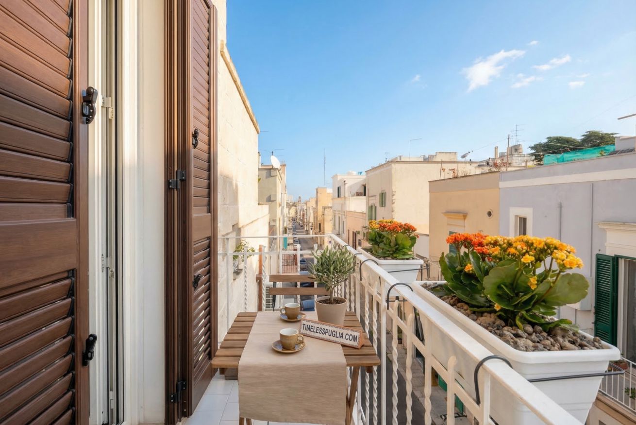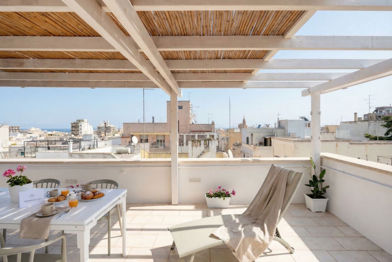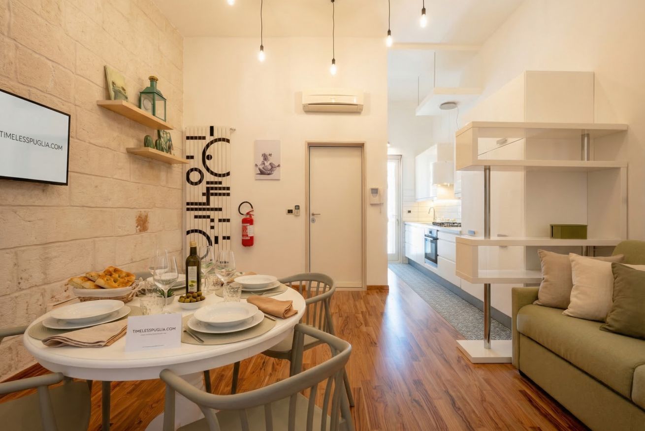 Experience the quintessential charm of Monopoli at Terrazza San Martino, an elegant one-bedroom apartment that perfectly captures the spirit of Puglia. Located on the first floor of a traditional building, this property serves as a sophisticated urban retreat designed for guests who appreciate thoughtful aesthetics and comfort. Upon entering, you are welcomed by an atmosphere of refined warmth, where historic exposed limestone walls meet sleek, modern high-gloss finishes and rich wooden flooring. The heart of the home is the open-plan living and dining area, featuring a sage green sofa bed and a round dining table that seats four, making it an ideal space to unwind after a day of exploration. The fully equipped modern kitchen, complete with a commercial-style faucet and artisanal patterned tile flooring, provides everything needed to prepare fresh Mediterranean meals. The bedroom is a tranquil oasis, highlighting a natural stone wall and soft, inviting linens, ensuring a peaceful night's rest. The bathroom is a true highlight of the home, boasting contemporary luxury through its blend of oversized matte grey tiles and authentic rustic stone, complete with a soothing bathtub-shower combination. The crown jewel of this residence is undoubtedly the expansive rooftop terrace. Shaded by a rustic bamboo pergola, this private outdoor sanctuary offers panoramic views of the city skyline, making it the perfect setting for morning coffee or sunset dinners under the stars. Adorned with vibrant flowering planter boxes and chic outdoor furniture, the terrace invites you to relax in the sun on provided loungers or enjoy al fresco dining in the crisp sea air. Every detail, from the vibrant abstract art to the carefully curated decor, has been chosen to provide a memorable stay. Whether you are walking through the narrow, picturesque streets of Monopoli or enjoying a quiet evening on your private terrace, this property offers a seamless blend of convenience and luxury