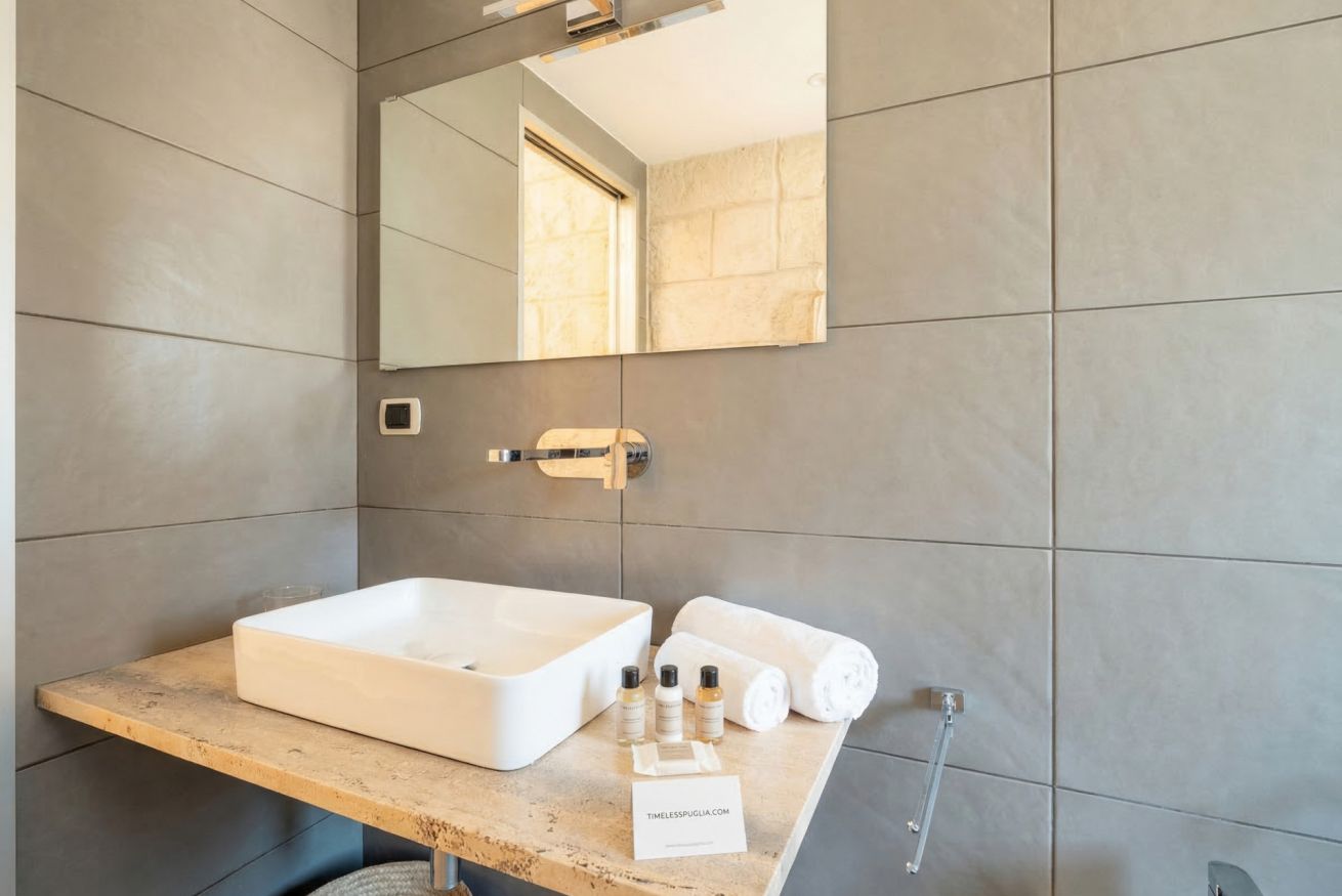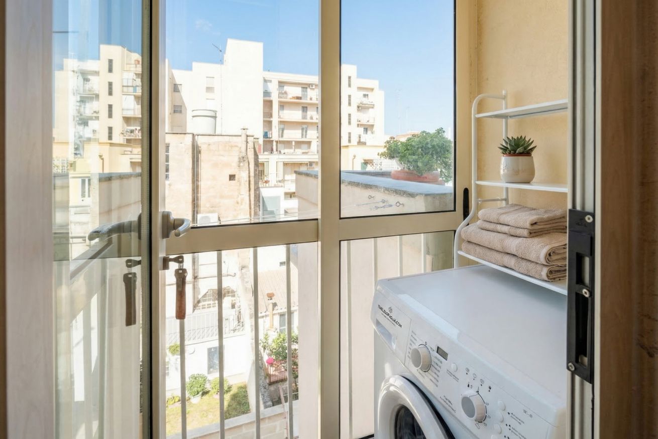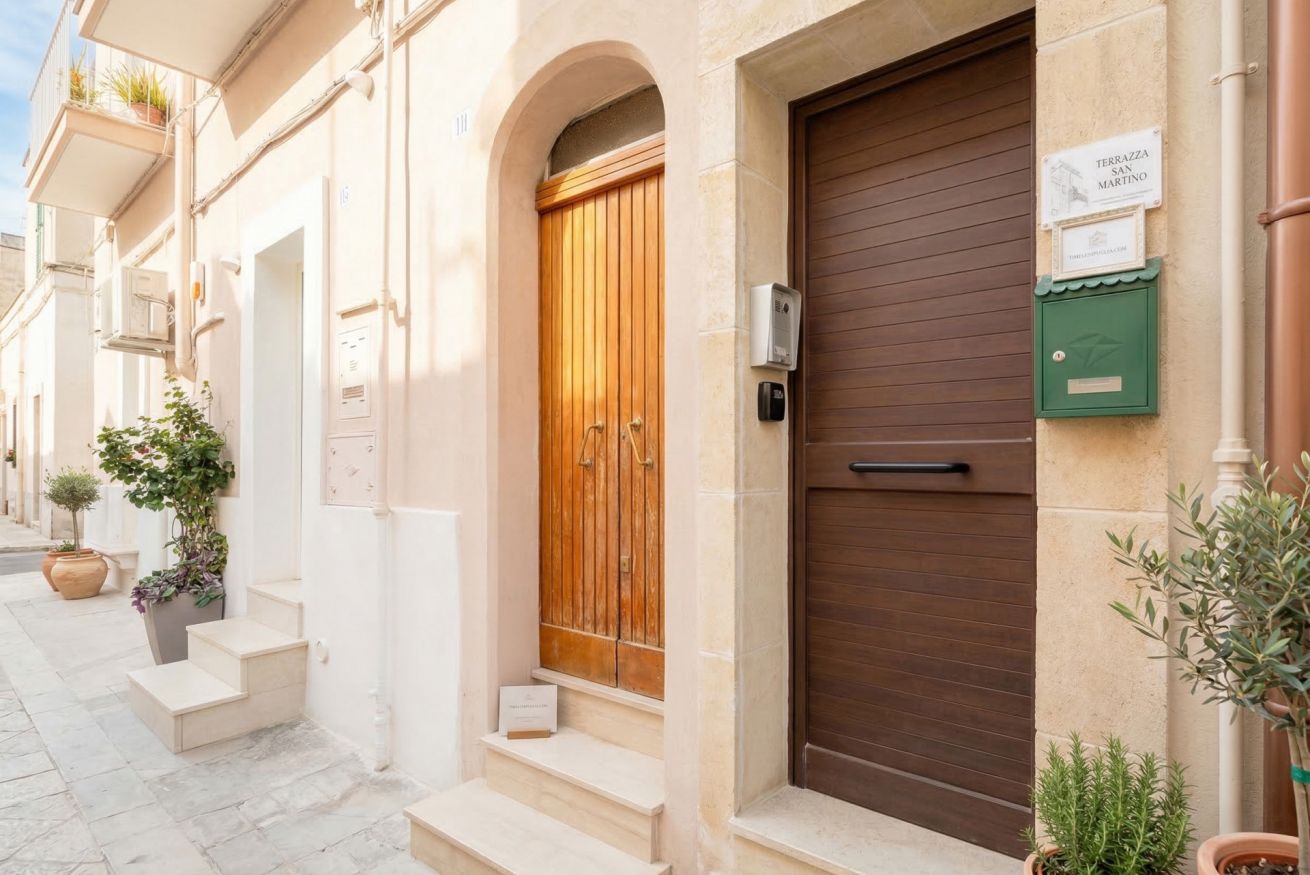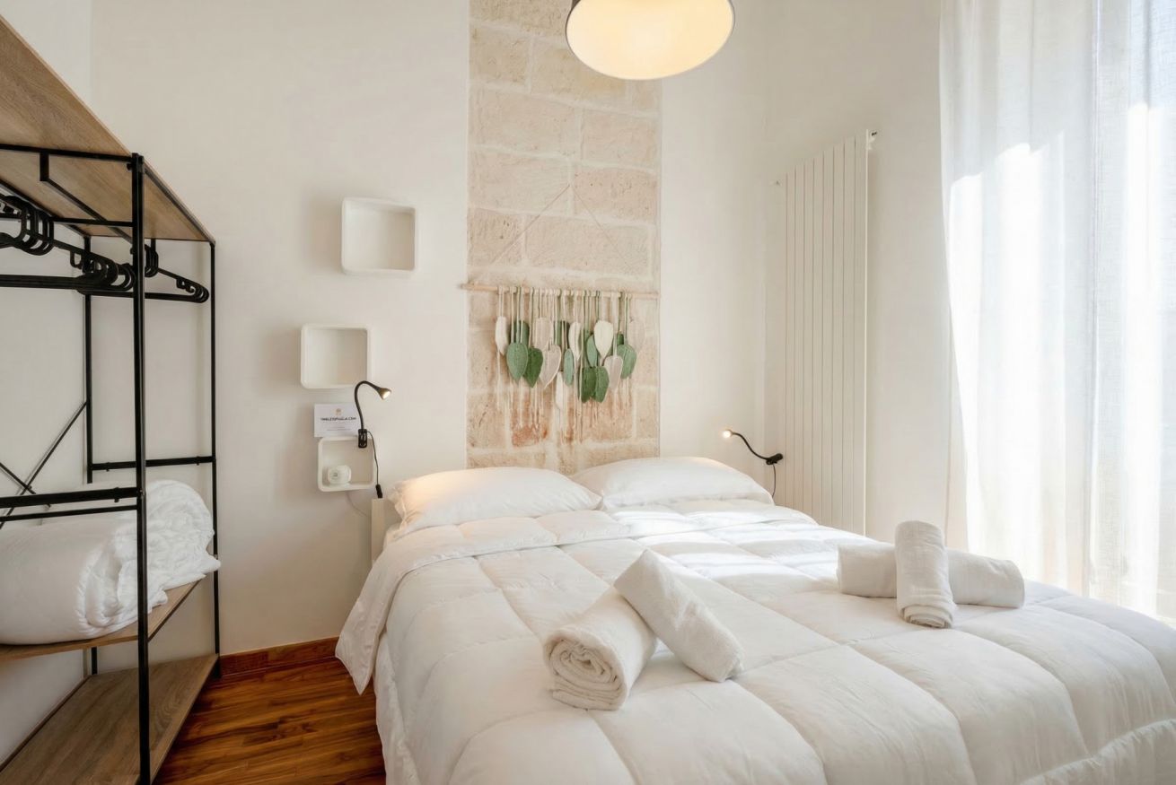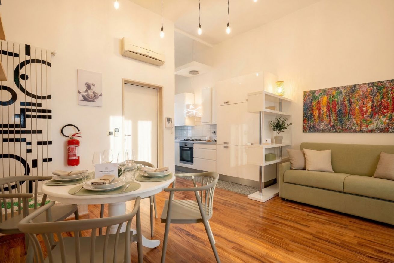 Experience the quintessential charm of Monopoli at Terrazza San Martino, an elegant one-bedroom apartment that perfectly captures the spirit of Puglia. Located on the first floor of a traditional building, this property serves as a sophisticated urban retreat designed for guests who appreciate thoughtful aesthetics and comfort. Upon entering, you are welcomed by an atmosphere of refined warmth, where historic exposed limestone walls meet sleek, modern high-gloss finishes and rich wooden flooring. The heart of the home is the open-plan living and dining area, featuring a sage green sofa bed and a round dining table that seats four, making it an ideal space to unwind after a day of exploration. The fully equipped modern kitchen, complete with a commercial-style faucet and artisanal patterned tile flooring, provides everything needed to prepare fresh Mediterranean meals. The bedroom is a tranquil oasis, highlighting a natural stone wall and soft, inviting linens, ensuring a peaceful night's rest. The bathroom is a true highlight of the home, boasting contemporary luxury through its blend of oversized matte grey tiles and authentic rustic stone, complete with a soothing bathtub-shower combination. The crown jewel of this residence is undoubtedly the expansive rooftop terrace. Shaded by a rustic bamboo pergola, this private outdoor sanctuary offers panoramic views of the city skyline, making it the perfect setting for morning coffee or sunset dinners under the stars. Adorned with vibrant flowering planter boxes and chic outdoor furniture, the terrace invites you to relax in the sun on provided loungers or enjoy al fresco dining in the crisp sea air. Every detail, from the vibrant abstract art to the carefully curated decor, has been chosen to provide a memorable stay. Whether you are walking through the narrow, picturesque streets of Monopoli or enjoying a quiet evening on your private terrace, this property offers a seamless blend of convenience and luxury